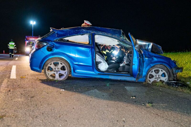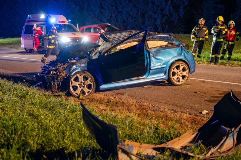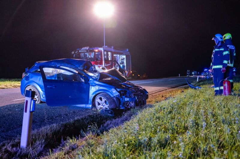 Der Mann war gegen 19:30 Uhr zusammen mit drei Freunden auf der L1064 Waldzeller Straße nach Schildorn unterwegs. Wegen eines Tieres, das über die Fahrbahn lief, verriss er das Fahrzeug und kam nach rechts auf das Straßenbankett. Der Pkw wurde in die Wiese geschleudert und überschlug sich mehrmals. Eine andere Autofahrerin sah den Unfall und setzte die Rettungskette in Gang.