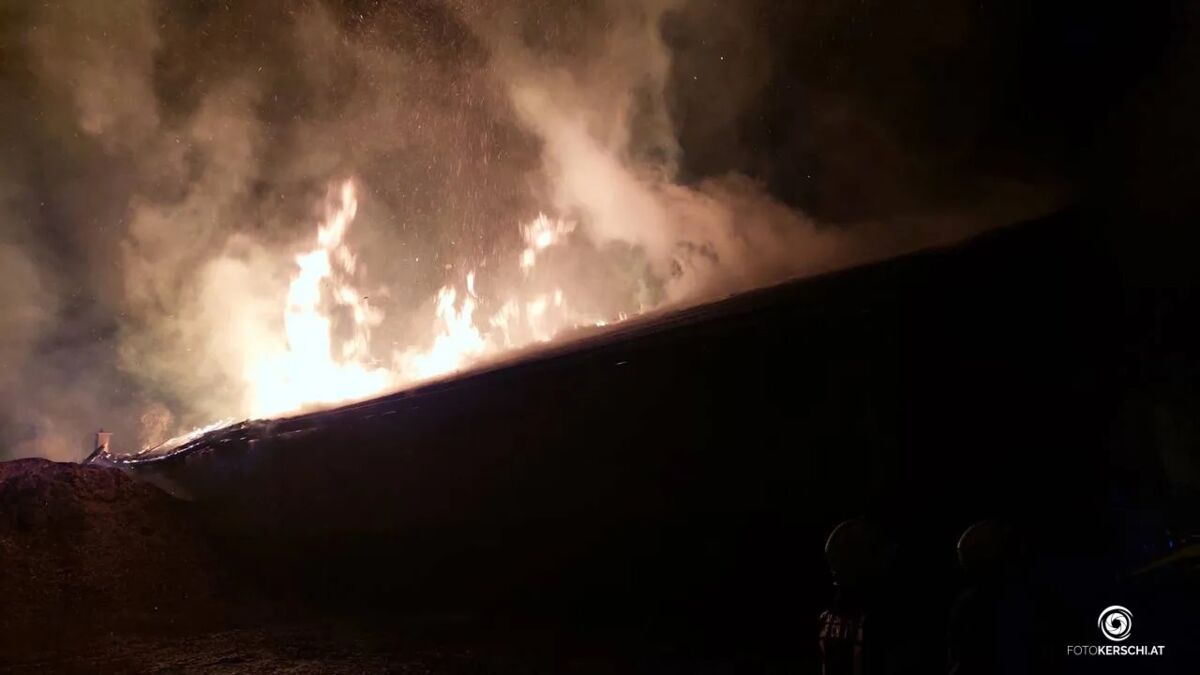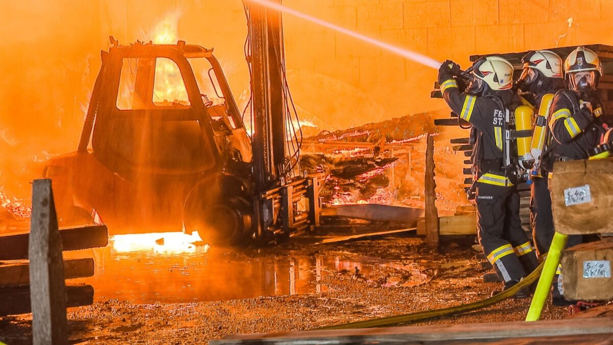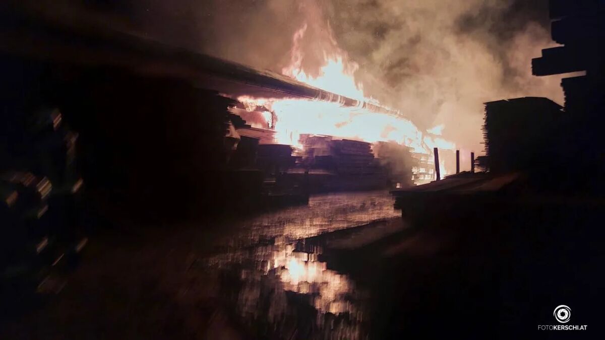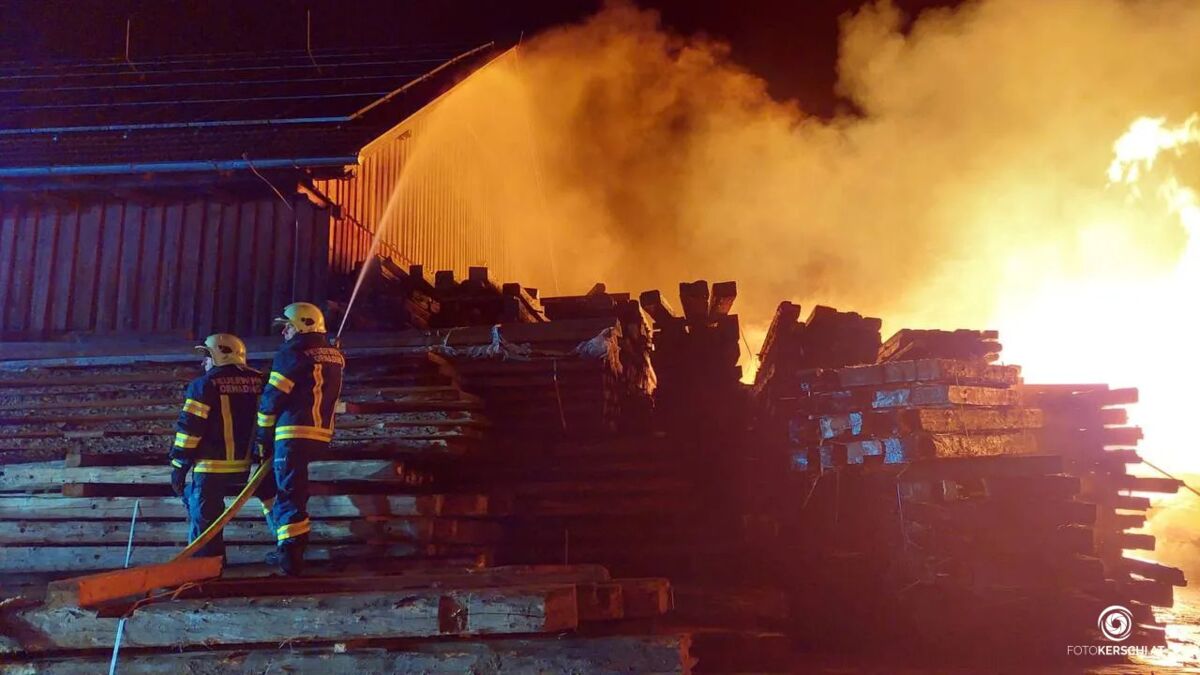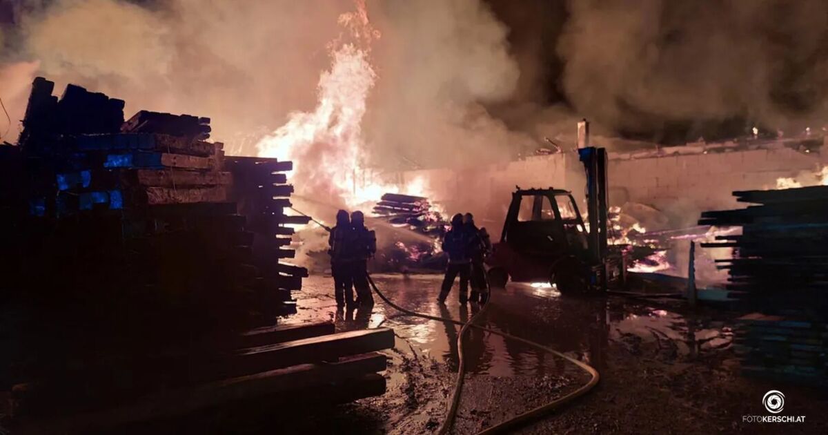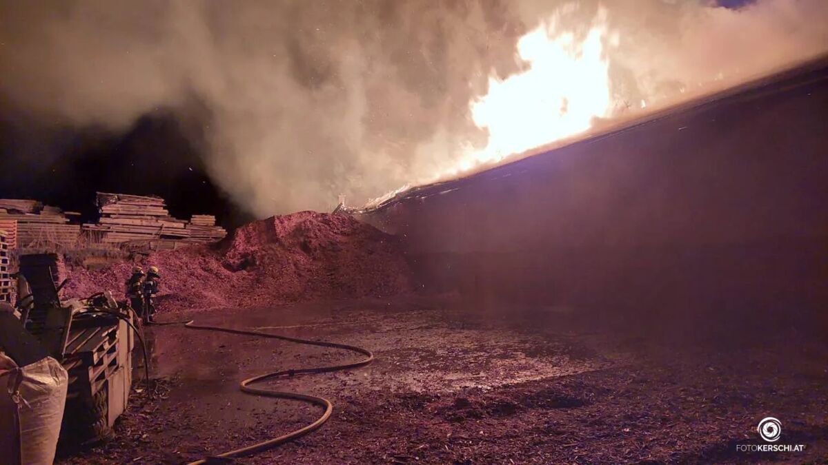 Gegen 23.54 Uhr wurde der Notruf wegen eines Feuers in einer Lagerhalle abgesetzt. Bereits beim Eintreffen der ersten Einsatzkräfte stand ein Großteil der Halle in Vollbrand. Die Brandlast war durch gelagertes Altholz besonders hoch, was zu einer raschen Ausbreitung der Flammen führte.
