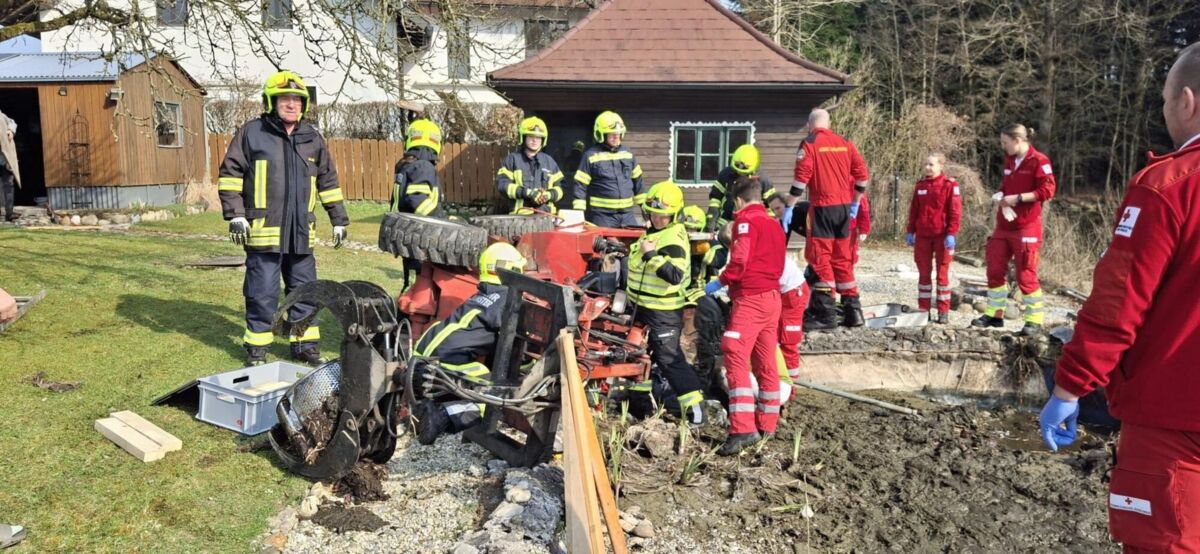 Beim Eintreffen der Einsatzkräfte zeigte sich eine komplexe Lage: Der Hoftrac lag seitlich im Biotop, die eingeklemmte Person war nur schwer zugänglich. Unter der Leitung der Notärztin arbeiteten Feuerwehr, Rotes Kreuz und Polizei eng zusammen.