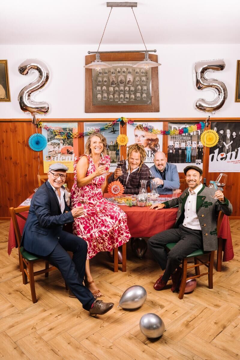 Für den „großen Durchbruch“, den Radio-Superhit oder das volle Stadion, waren Birgit Denk und ihre Buben irgendwie immer zu früh, zu spät, zu alt, zu laut oder auch manchmal zu leise. Immer irgendwie „komplett out“. Aber sie sind noch da. Spielfreudig, authentisch, engagiert, nahbar, lustig, ernst und so einmalig „zaum ghatzt“ wie es nur Bands erreichen, die 25 Jahre miteinander spielen.