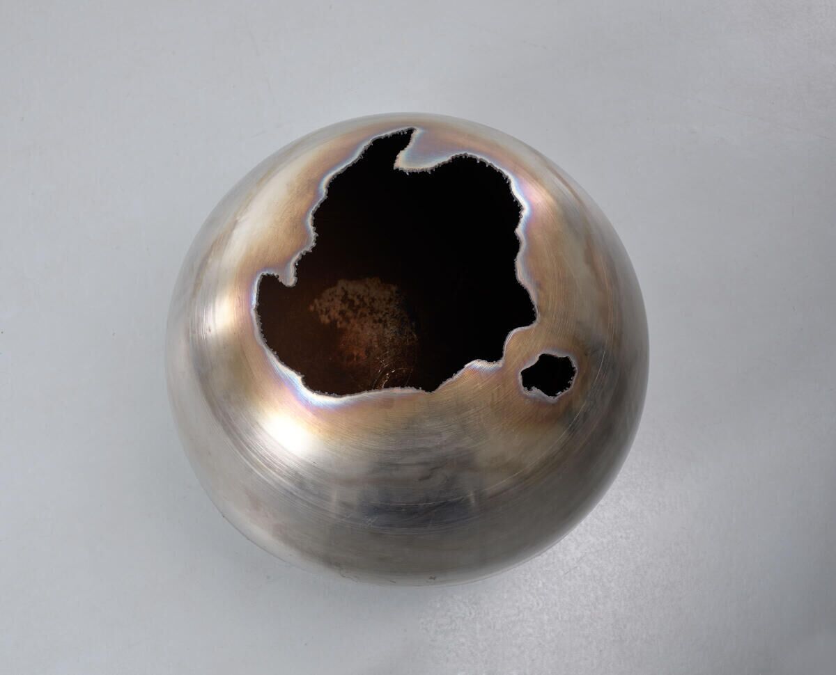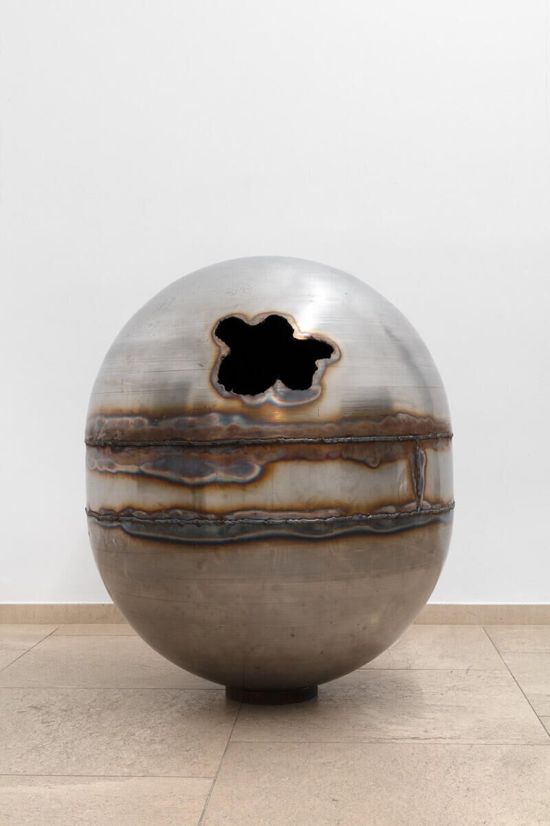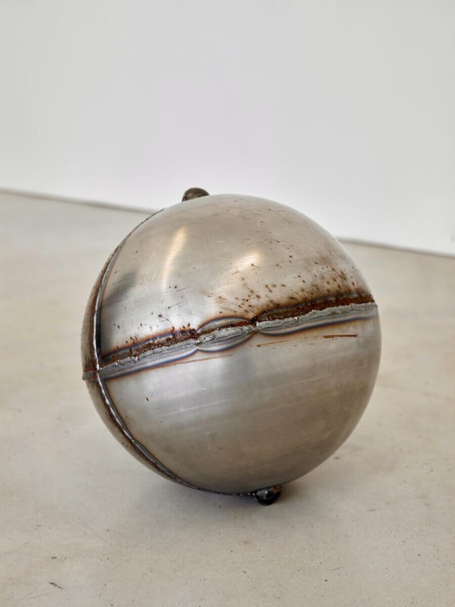 Manche der auf dem Boden platzierten Edelstahlobjekte setzen sich aus jeweils zwei Halbkugeln, die mit einem zylindrischen Ring verbunden sind, zusammen. Im Kontrast zur Symmetrie der Skulpturen mit ihren gerillten, handwerklich perfekt gearbeiteten Oberflächen stehen die Anlauffarben der Schweißstellen sowie Löcher, die die Außenhülle aufreißen und den Blick ins dunkle Innere der Formen freigeben. Die Objekte mit ihren Deformationen sind Zeugnisse eines Richtungswechsels, einer ungeplanten Wegstrecke, bestimmt von der komplexen Beziehung zwischen Mensch, Technik und Natur.