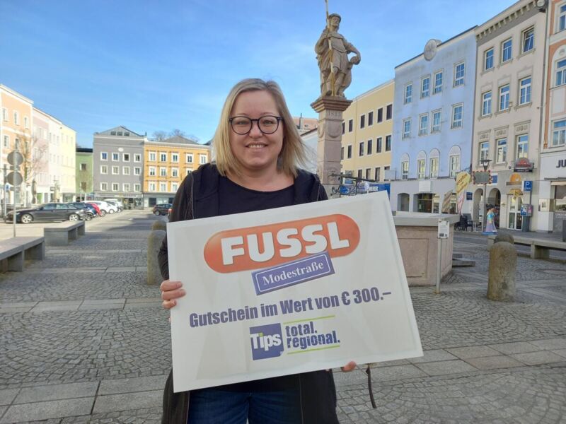 RIED. RIED. Evelyn Siegetsleitner war am Hauptplatz unterwegs, um einen Heringkäse beim Metzger ihres Vertrauens einzukaufen, als sie zufällig auf das Glücksengerl traf. Denn das Tips-Glücksengerl verteilt wieder Gutscheine der Fussl Modestraße an treue Tips-Leser.¶