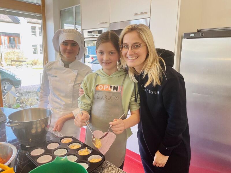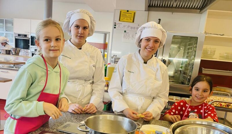 Was kann man von Kindern voraussetzen? Welche Speisen essen sie gerne? Was mögen sie nicht? Diese Fragen und einige mehr stellten sich die Jugendlichen bei der Vorbereitung auf das gemeinsame Kochen. Gleich zwei Mal zu Gast waren die Kinder der Nachmittagsbetreuung Geinberg mit ihren Betreuerinnen. Eine davon, Lisa Gattermaier aus Senftenbach. Sie hat die Fachschule selbst absolviert und kennt die Vorteile der praktischen Ausbildung. Die Kinder aus Geinberg waren mit voller Begeisterung dabei. Mit Freude wurde an gemeinsamen Pausenbroten gearbeitet. Mit Paprikastreifen, Radieschen- und Karottenscheiben wurden die Brote mit lustigen Gesichtern verziert und somit auch das Gemüse gut verpackt. Pizza selbst zu backen, war eine der Lieblingsstationen und auch ein paar Palatschinken-Profis waren dabei. Mit dieser Aktion konnte auch die Ernährungserziehung in der Schule praktisch gelebt werden.