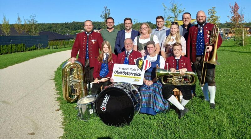 Landesgeschäftsführer Florian Hiegelsberger (ÖVP) ist oberösterreichweit unter dem Motto „Sommer des Miteinanders“ auf Tour und ehrt beziehungsweise bedankt sich mit einem kleinen Geschenk bei Persönlichkeiten und Familien für ihren Einsatz in der Gemeinde. Auf Vorschlag von Benjamin Salhofer – er tritt übrigens am 8. Oktober zur Bürgermeisterwahl an – wurde Familie Neumayer/Wiesbauer ausgewählt. Vom Opa bis zum Enkel spielt man bei der „Musi“ mit. Opa Rudolf Neumayer spielt die große Trommel und ist seit 1970 im Musikverein. Markus Wiesbauer spielt Bass und besitzt das silberne Leistungsabzeichen. Christian Neumayer trägt das goldene Leistungsabzeichen und spielt seit 1993 Schlagzeug und Posaune. Lisa (20) hat das Leistungsabzeichen in Silber und Julia (16) ist ebenso eine talentierte Musikerin. Sie spielt Querflöte, Schlagzeug und erlernt gerade die steirische Harmonika. Sie hat auch das Leistungsabzeichen in Silber. Felix (13) ist stolzer Besitzer des bronzenen Leistungsabzeichen und spielt Euphonium. Er ist seit 2020 bei der Musikkapelle. „Was wäre eine Gemeinde ohne Blasmusik. Danke für euren Einsatz“, so Florian Hiegelsberger, der selbst begeisterter Musiker ist.
