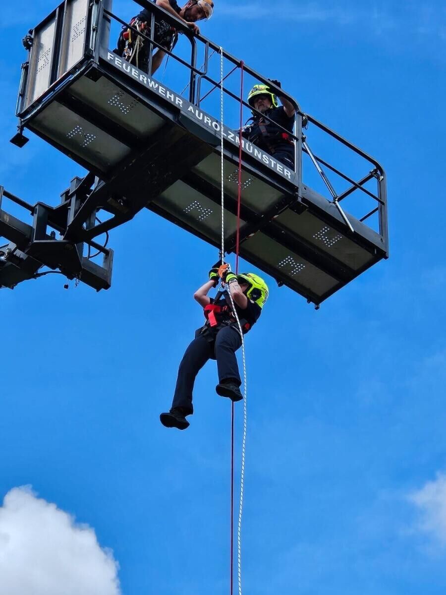 AUROLZMÜNSTER. Keine Höhenangst durften die Aurolzmünsterer Feuerwehrkameraden bei einer Übung mit Franz Helml, einem Spezialisten für Höhensicherung, haben. Er schulte die Einsatzkräfte in Absturzsicherung und Selbstrettung aus einem Arbeitskorb in luftigen 17 Metern Höhe.