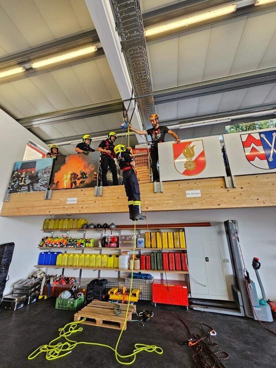 Franz Helml vermittelte den Feuerwehrkameraden nicht nur grundlegendes Wissen, sondern zeigte ihnen auch das richtige Handling. Im Rahmen der Übung hatten die Teilnehmer Gelegenheit, das korrekte Anlegen der Ausrüstung, das Rückhalten und das Abseilen praktisch zu üben. Dies erfordert höchste Präzision und Routine. Ein besonderer Höhepunkt der Übung war das Szenario einer Selbstrettung aus einem Arbeitskorb in 17 Metern Höhe, das an einem „defekten“ Merlo simuliert wurde. Hierbei mussten zwei verschiedene Rettungssysteme eingesetzt werden, um sich auf verschiedene Notfallsituationen vorzubereiten. Diese Übung verdeutlichte eindrucksvoll, wie wichtig es ist, im Ernstfall ruhig und besonnen zu handeln und die richtigen Maßnahmen zu ergreifen.
