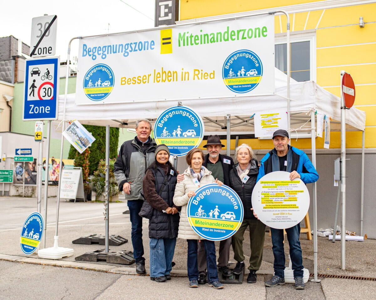 Sechs Mitglieder von „Besser leben in Ried“ waren mit einem Info-Stand beim Kaiserhof vor Ort – ein Platz, der verkehrsmäßig stark frequentiert ist und daher ideal für die Aktion. Das auffällige Zelt und ein großes Banner mit der Aufschrift „Begegnungszone = Miteinanderzone“ weckten die Neugier.