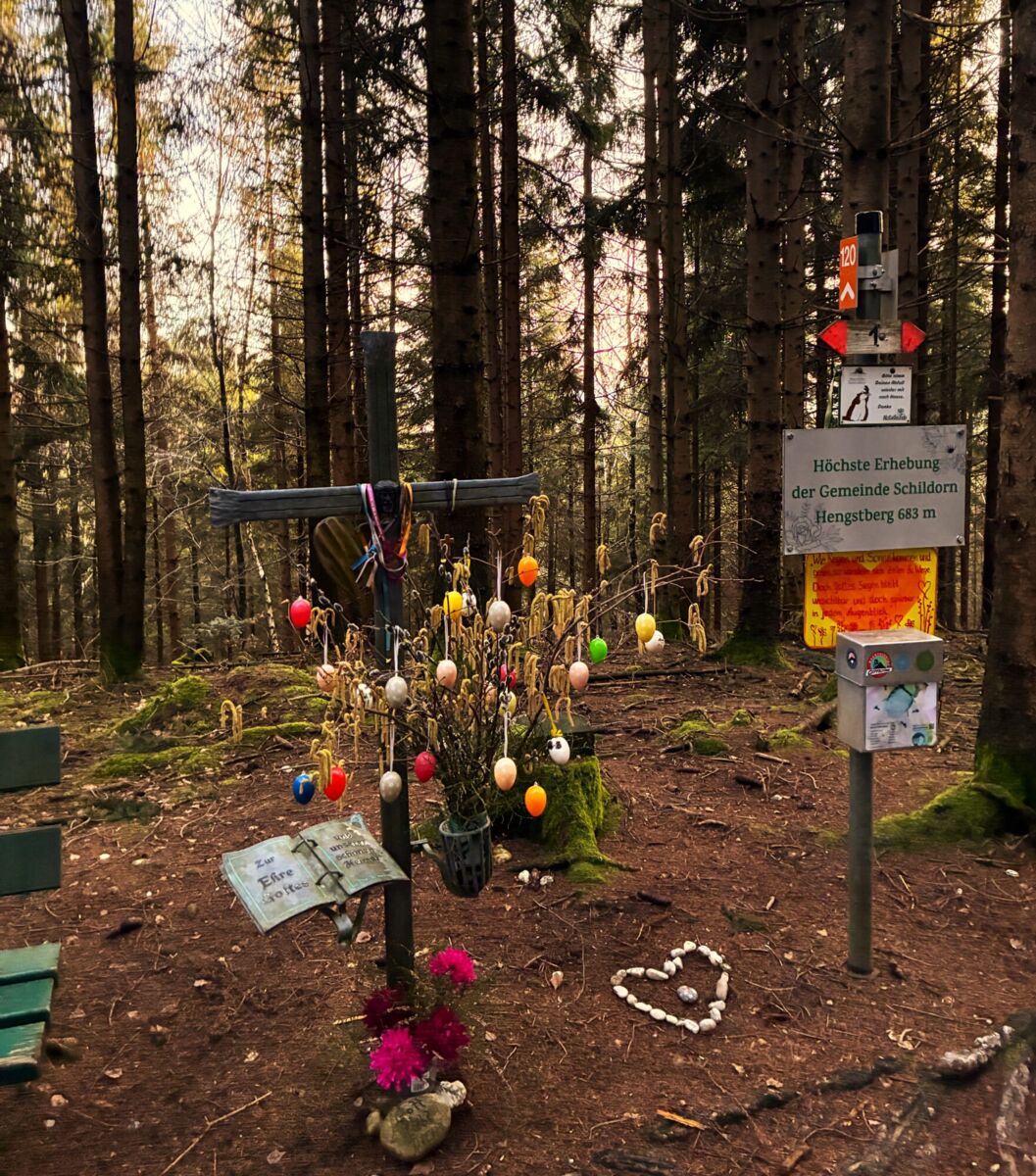 Familien und tägliche Besucher des „ Hengsten“ gestalten das Gipfelkreuz des Schildorner Hausberges am Hausruck .