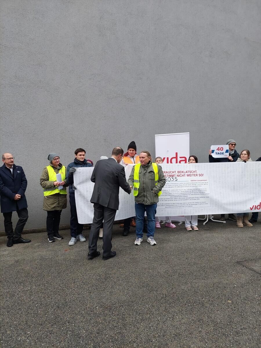 Neben dem Krankenhaus Barmherzige Schwester Ried versammelten sich Beschäftigte auch vor dem Krankenhaus Barmherzige Brüder Linz und dem Klinikum Wels-Grieskirchen. Insgesamt 6.035 Unterschriften umfassen die Unterstützungserklärungen, die an die jeweiligen Klinikleitungen sowie an zuständige Politiker übergeben wurden.