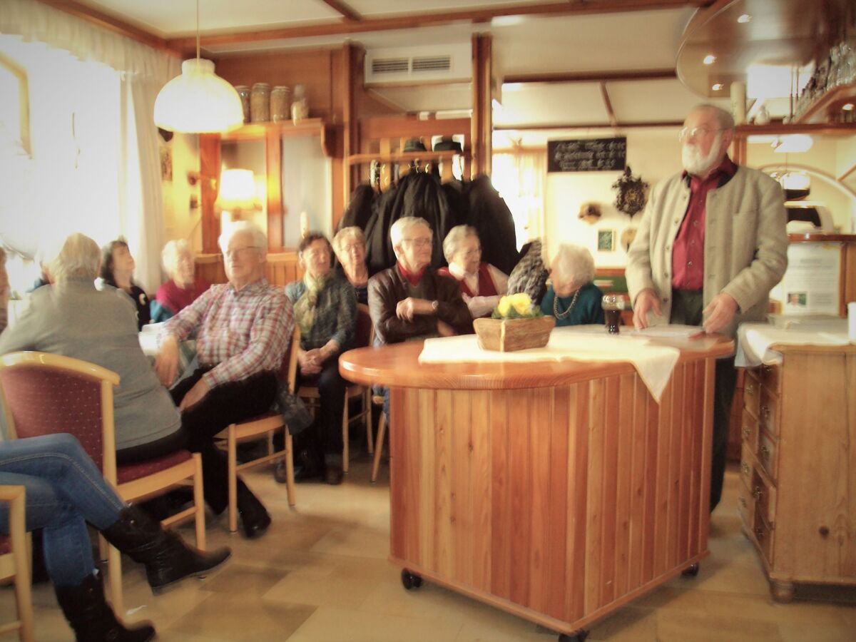 Die Gaststube war bis auf den letzten Platz gefüllt und die illustre Zuhörerschaft wartete gespannt auf die Mundartlesung von Dr. Gumpenberger. Dieser begeisterte mit zahlreichen Anekdoten, Gedichten und lustigem aus dem Leben, welches, mit zwischendurch anhaltendem Applaus, bedacht wurde. Zur Freude der Zuhörer und zum Mitsingen animiert, wurden von Erni Zippusch bekannte Lieder zwischen den einzelnen Lesungen, angestimmt. Dr. Gerhard Kübelböck, welcher dieses Arrangement durch freundschaftliche Verbundenheit mit Dr. Gumpenberger zustande gebracht hat, dankte im Namen des Seniorenringes und der Gäste, dem, im ganzen Land bekannten Moderator, für seine unterhaltsamen Beiträge.