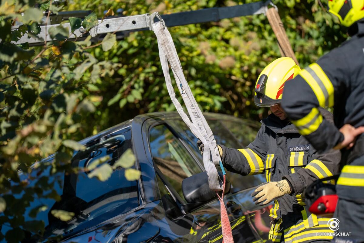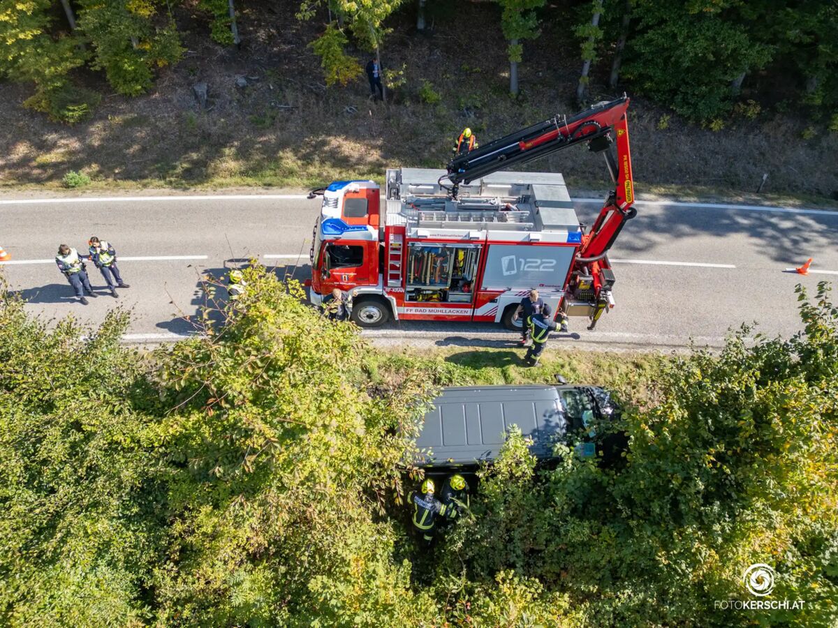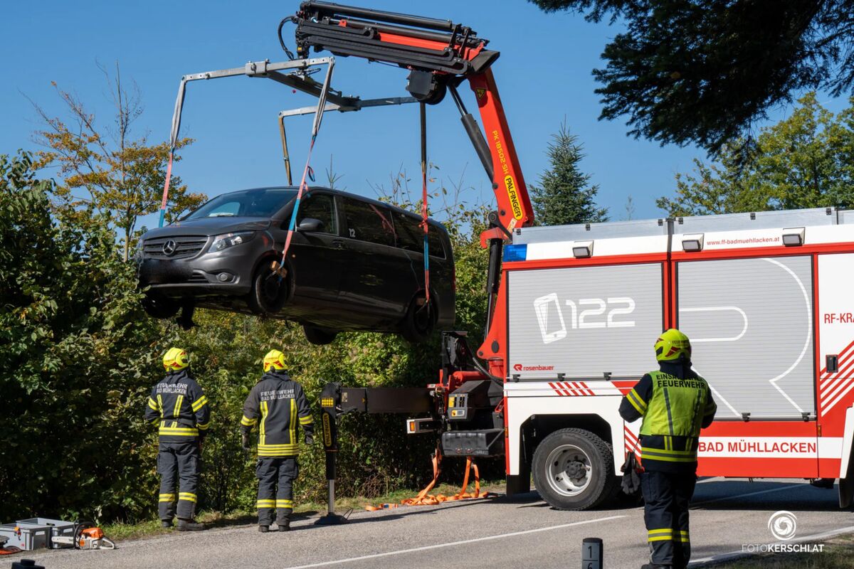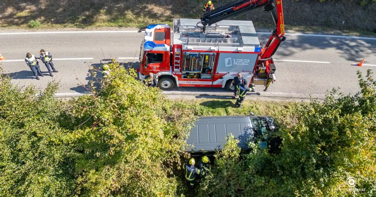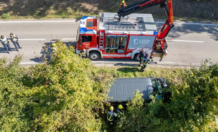 Freitagmittag ereignete sich ein Verkehrsunfall auf der St. Martiner Straße, bei dem ein Kleinbus aus unbekannten Gründen von der Straße abkam und auf einem Baumstumpf zum Stehen kam. Glücklicherweise verhinderte der Baumstumpf, dass das Fahrzeug die Böschung hinabkippte. Der Fahrer war allein im Fahrzeug und erlitt Verletzungen unbestimmten Grades. Rettungskräfte versorgten ihn und brachten ihn zur Kontrolle ins Krankenhaus. Um das Fahrzeug schonend zu bergen, wurde die Feuerwehr Bad Mühllacken mit einem Kran hinzugezogen. Während der Bergung musste die Straße kurzzeitig komplett gesperrt werden, war aber zuvor einspurig befahrbar.