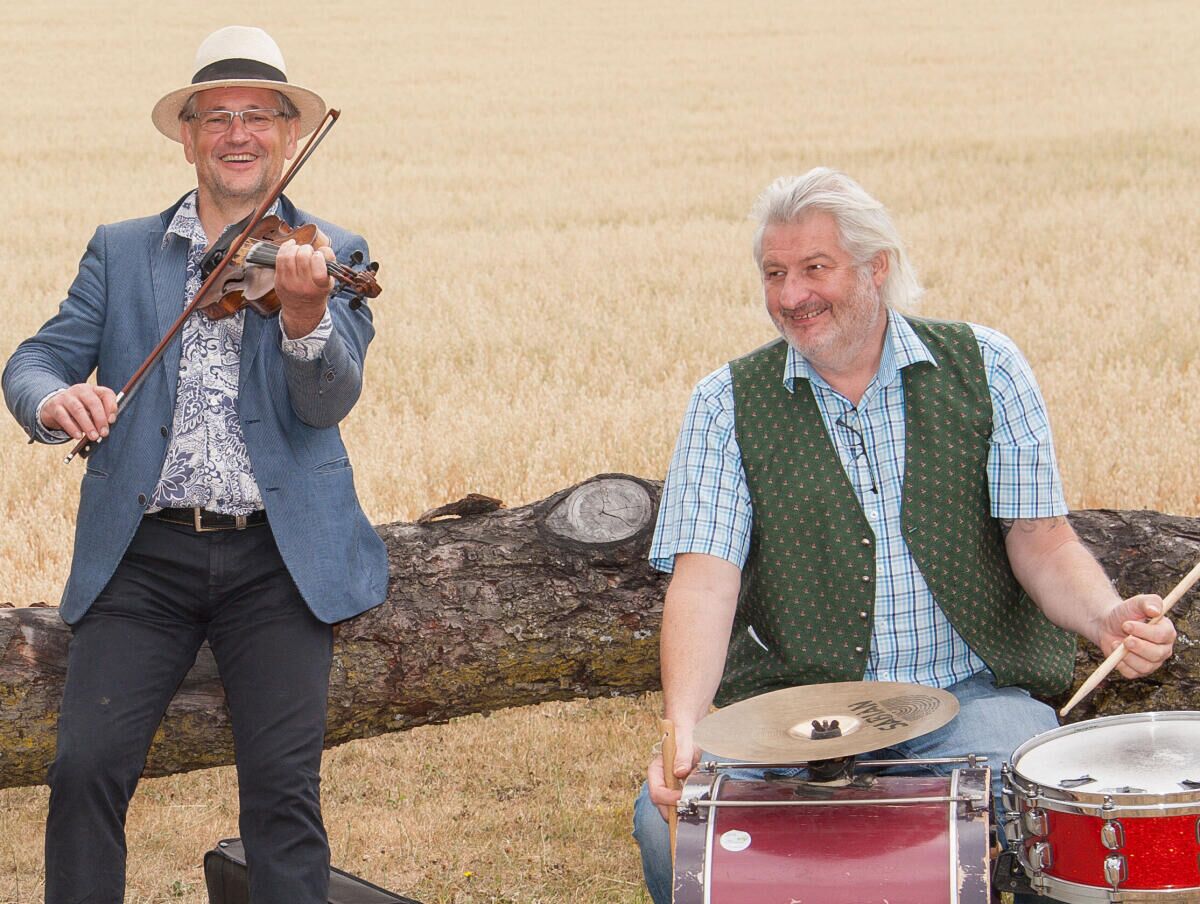 „Wir spielen wasdawö – das heißt Stücke, die wir kennen, und Stücke, die einfach gerade daherkommen. Das nennen wir Echtzeitmusik“, beschreibt Gotthard Wagner, der bei wiadawö die Geige spielt. Gemeinsam mit Andreas Luger an der Trommel bildet er die Stammbesetzung der Gruppe, die aus etwa zehn Musikanten besteht und sich je nach Anlass immer wieder neu zusammenwürfelt. Für das Konzert in der Kunsthalle gesellt sich Günter Wagner am Akkordeon dazu.