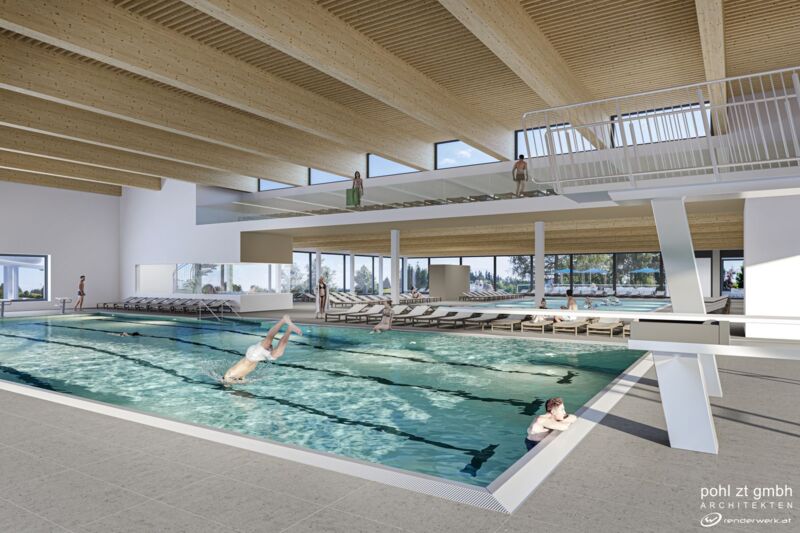 Mit einer einzigartigen Aquacross-Anlage, also einem Hindernis-Parcours über dem Wasser, will man Spaß und Action ins Schwimmbecken bringen. Im sonnigsten Teil der Schwimmhalle liegt der Eltern-Kindbereich für Familien mit Kleinkindern und sportliche Schwimmer wiederum können sich über ein 25 Meter-Becken mit 1 Meter-Sprungbrett und 3 Meter-Plattform freuen. Im Mittelteil liegt eine Galerie mit Rutschturm, der auch vom Freibad zugänglich ist. „Einen Saunabereich haben wir hintangestellt, weil sich dieser nicht leistbar gewesen wäre und es dafür auch keine Fördermittel von öffentlicher Hand gibt. Möglich wäre aber eine Sauna in einer zweiten Ausbaustufe oder in Verbindung mit einem Hotel“, informiert Ferdinand Oberer. Ein Gastronomiebereich ist sowohl für Badegäste als auch für externe Gäste vorgesehen. Die benötigten Parkplätze liegen im Untergeschoß des Gebäudes.