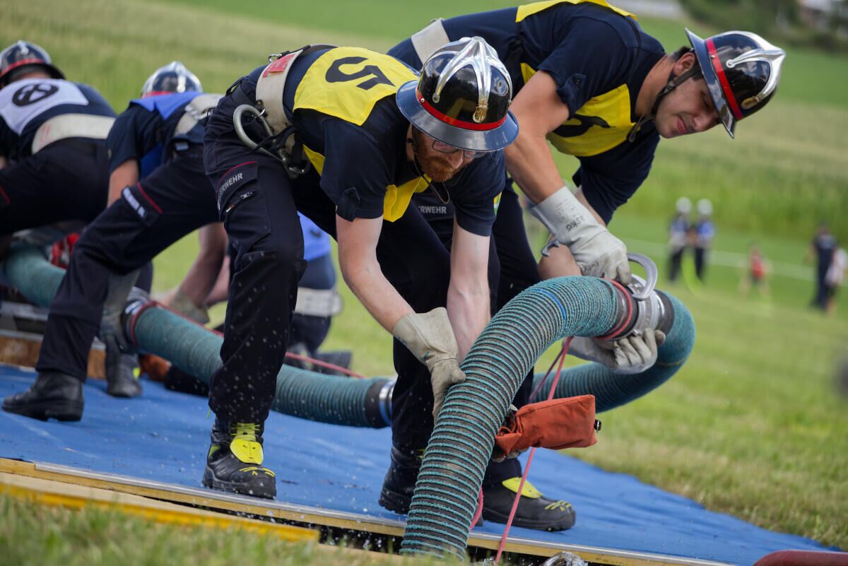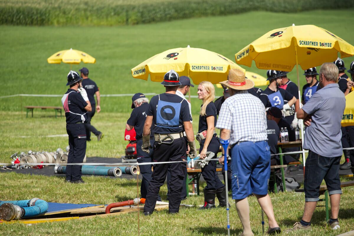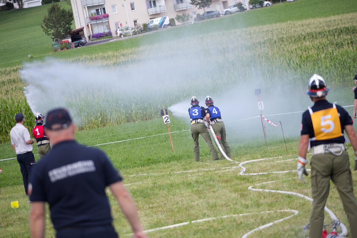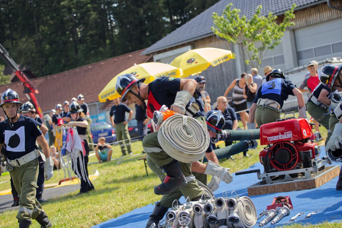 Bei einem Nassbewerb wird der Löschangriff durch die teilnehmen Feuerwehrkameraden nicht trocken sondern mit Wasser durchgeführt. Somit ist auch vom Maschinisten beim Ansaugen des Wassers vollster Einsatz gefragt. Dieser hat daher die Aufgabe, die Pumpe nach dem Auslegen der Saugleitung zu starten und das Wasser anschließend über die Schlauchleitung nach vorne zu befördern. Dass dabei auch die Bewerbsteilnehmer nass werden können, zeigte sich bei diesem Bewerb - und sorgte an dem heißen Tag für eine guttuende Abkühlung.
