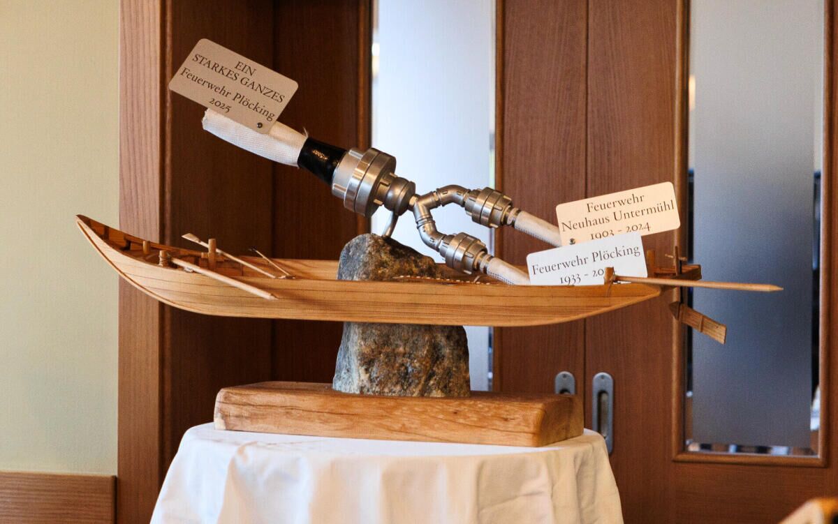 Als Zeichen der künftigen Verbundenheit haben einige Kameraden eine Skulptur gestaltet. Sie symbolisiert die Fusion und die Verbundenheit mit der Heimat. Der Neuhauser Granit trifft dabei auf eine Plätte und zwei Schläuche vereinen sich zu einem größeren Schlauch.