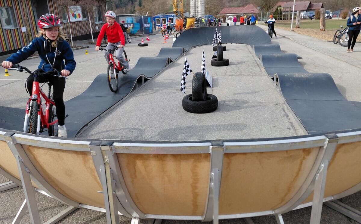 Belohnt wurden die Schüler mit einem ganz speziellen Radfahrvergnügen: Sie durften nämlich einen Pumptrack befahren, der nur für diesen Frühlingstag neben der Schule aufgebaut wurde. „Es war so cool, im Pumptrack über die Wellen und Steilkurven zu fahren“, zeigt sich Klassensprecher Andreas aus der 1b begeistert.