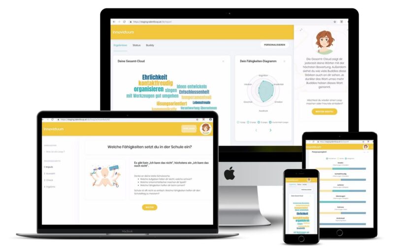 Analog und digital gehen hier Hand in Hand: Die Jugendlichen bekommen ein Arbeitsheft, das durch passende interaktive Tools ergänzt wird. Die begleitende Website www.ichwerde.at bietet zusätzliche Informationen für Schüler, Lehrer, Eltern und Unternehmen. Mit der digitalen Web-Applikation Innoviduum TalentLoop ist es möglich, die Erkenntnisse und Entwicklungen über die Schulstufen hinweg zu speichern, zu erweitern und immer verfügbar zu haben. Jedes Jahr kommen neue Themenbereiche und didaktische Konzepte hinzu. TalentLoop begleitet die Schüler vom Erkennen der eigenen Interessen bis zur Entscheidung in welche berufliche Richtung sie sich entwickeln werden.