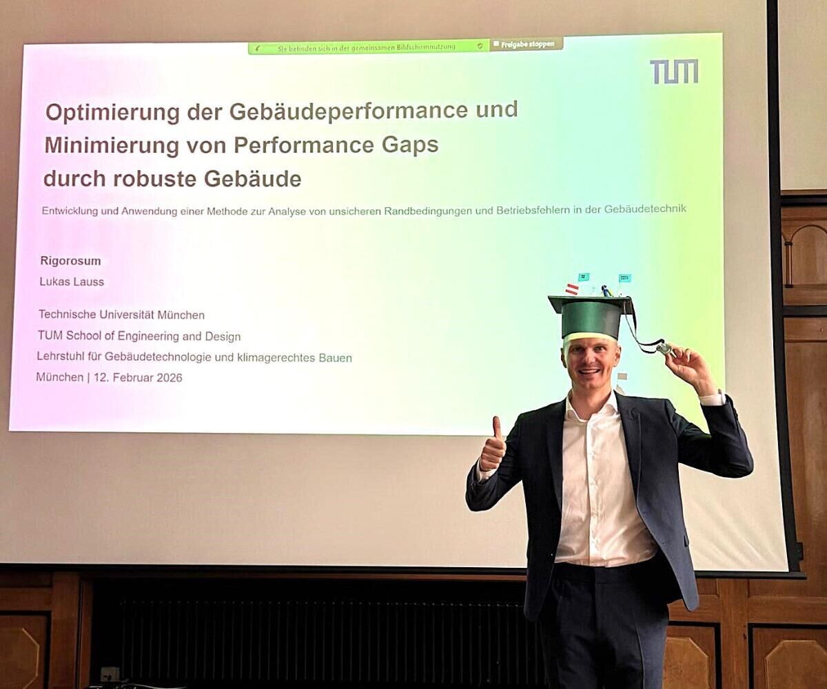 „Im Zentrum meiner Arbeit steht die Entwicklung zukunftsfähiger Lösungen für Gebäude und Quartiere – mit dem Ziel, Energieeffizienz, Nachhaltigkeit und Aufenthaltsqualität der gebauten Umwelt gleichermaßen zu verbessern“, beschreibt Lukas Lauss, der als vorläufigen Höhepunkt seiner wissenschaftlichen Laufbahn jetzt seine Dissertation zu diesem Thema erfolgreich verteidigt hat.