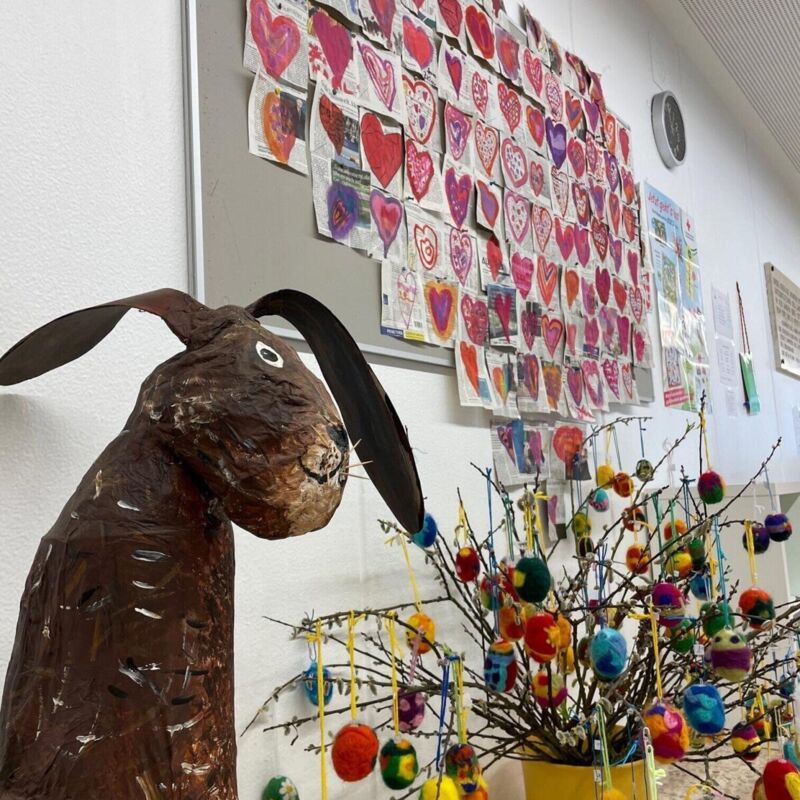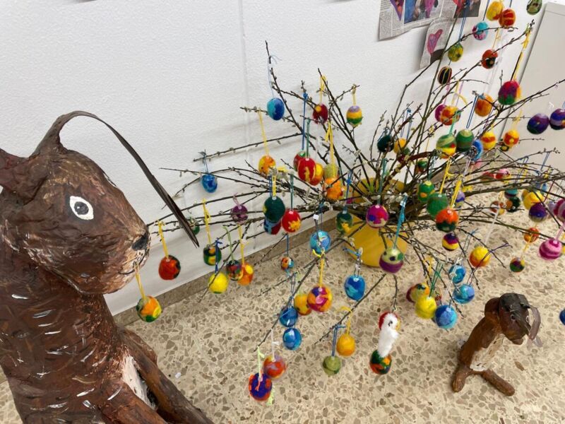 Da wird der Osterhase aber staunen - insgesamt 112 Ostereier hängen an den Zweigen, gefilzt von den Kindern der Volksschule. Jedes Kind – von der 1. bis zur 4. Klasse – durfte ein Ei nach eigenen Entwürfen filzen. Unterstützt wurden die Lehrerinnen dabei von ihrer ehemaligen Kollegin Mag. Monika Hasabent, die dafür gerne noch einmal aus der Pension in die Schule zurückkehrte. Der farbenprächtige Osterstrauß begrüßt derzeit alle Besucher der Volksschule.