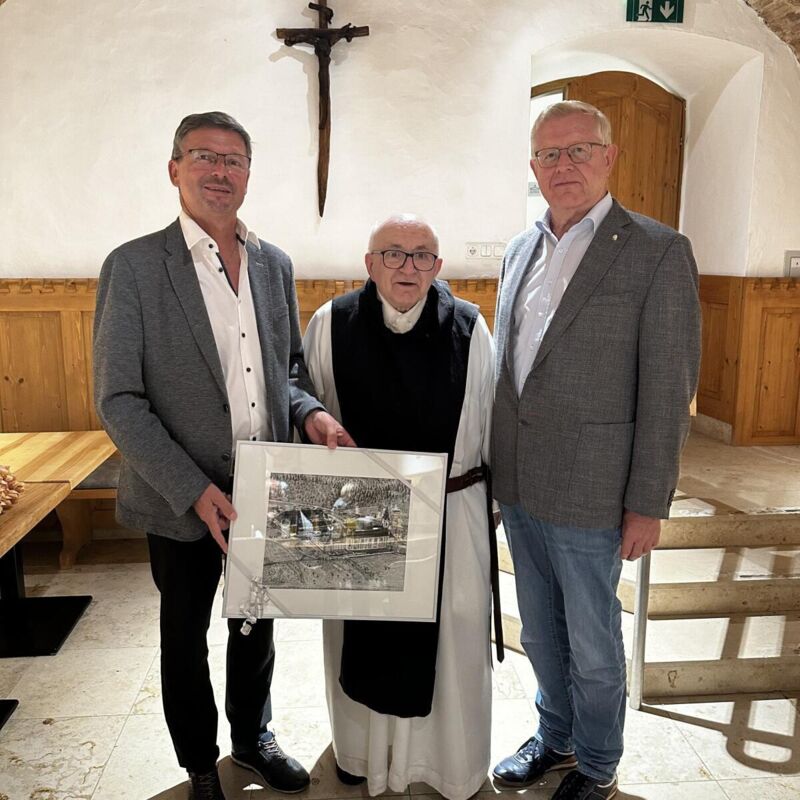 Ob es allerdings gelingt, dass ein neuer Orden in Stift Engelszell einzieht, ist aber aufgrund der Nachwuchsproblematik in den meisten Ordensgemeinschaft noch zu bezweifeln. Altabt Marianus Hauseder, der sich nun nach Vöcklabruck verabschiedet hat, dankte im Rahmen eines Gottesdienst in kleinem Kreis allen für ihre Unterstützung in den 42 Jahren im Stift Engelszell, vor allem für die 22 Jahre, die er als Abt verdienstvoll gewirkt hat. Er hob dabei auch das stets gute Einvernehmen mit der Marktgemeinde Engelhartszell hervor. Bürgermeister Roland Pichler überreichte Hauseder im Rahmen der Marktgemeinde ein von Tourismus-Geschäftsführerin Karin Wundsam gezeichnetes Bild des Stiftes Engelszell. Auch Pichlers Vorgänger Friedrich Bernhofer überbrachte Dankes- und Lobesworte an den scheidenden Abt und bezeichnete ihn als „den großen Baumeister des Trappistenstiftes Engelszell“.