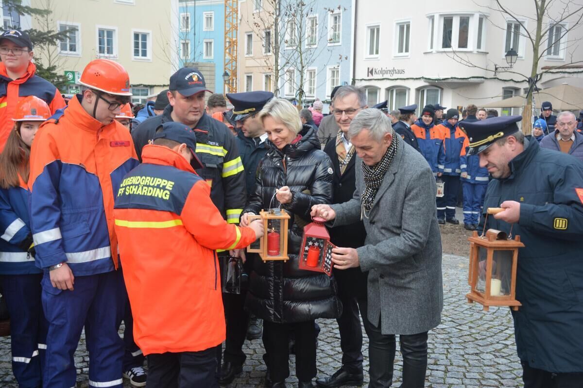 Unter den Ehrengästen befanden sich die Bürgermeister Günter Streicher (Schärding) und Stefan Dorn (Haarbach) sowie die stellvertretende Landrätin Cornelia Wasner-Sommer. Die Feuerwehrführung beider Länder war ebenfalls vertreten: Für Oberösterreich unter anderem Landes-Feuerwehrkommandant-Stellvertreter Michael Hutterer und Bezirks-Feuerwehrkommandant Johannes Veroner, für Bayern KFV-Vorsitzender Stefan Drasch und Kreisbrandinspektor Christian Gründl. Das Licht wurde symbolisch von Jonas aus Schärding an Malon von der Feuerwehr Haarbach überreicht.