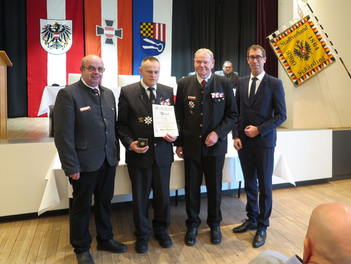 Zunächst wurde LRePr. und Bezirksschriftführer Johann Wimmeder für seine jahrzehntelange, verlässliche und redegewandte Arbeit im OÖKB mit dem Landesverdienstkreuz mit Stern in Silber geehrt. Die Laudatio hob seine ruhige, präzise und stets kameradschaftliche Art hervor – Eigenschaften, die ihn weit über den Bezirk hinaus zu einem geschätzten Vertreter des Kameradschaftsbundes machen.