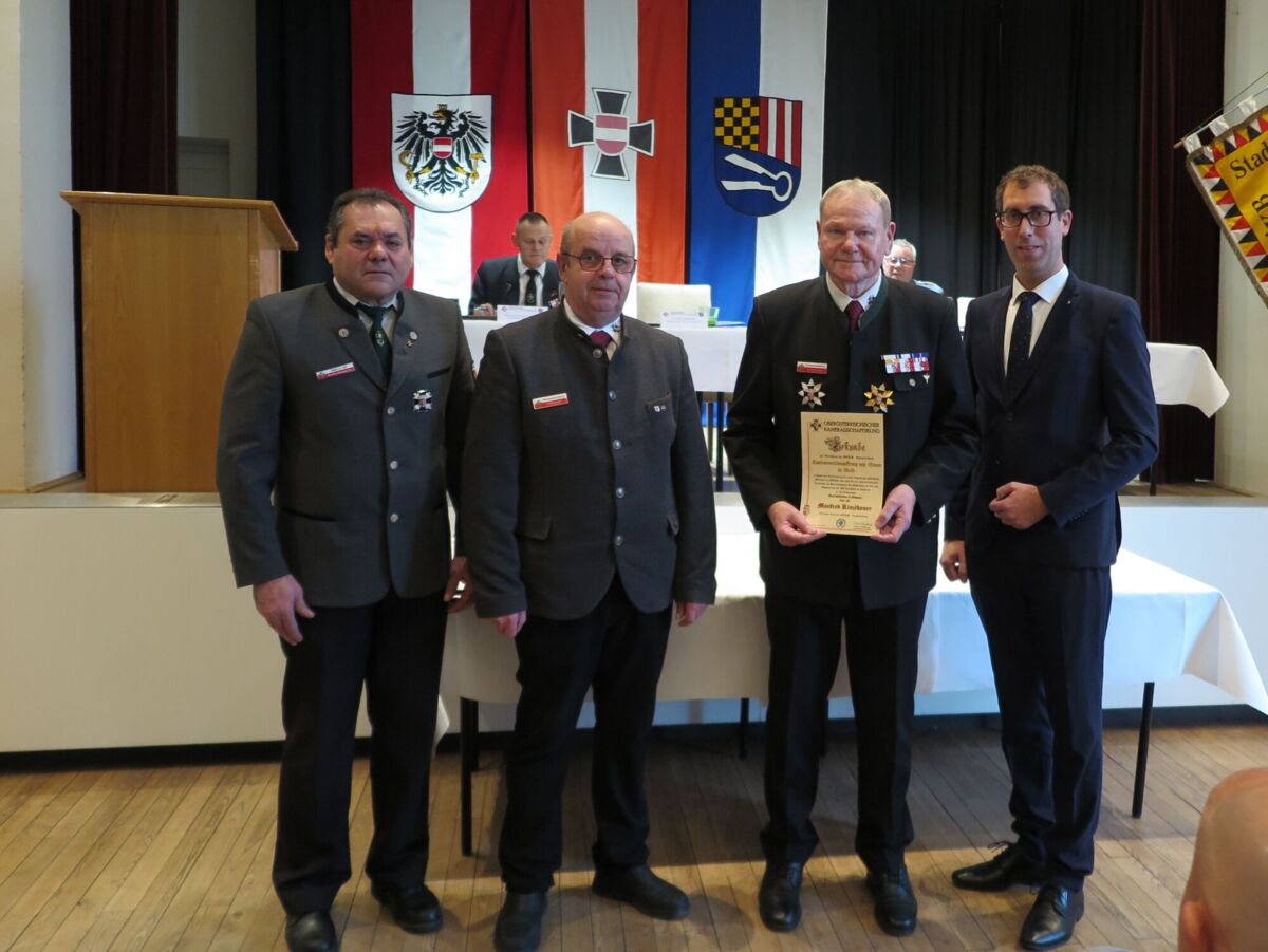 Anschließend wurde Bezirksobmann Manfred Kinzlbauer selbst überrascht: Für seine langjährige Tätigkeit – vom Obmann der OG Rainbach über vier Jahre als Bezirksschriftführer, zwölf Jahre als BObm‑Stellvertreter bis hin zur Führung des Bezirks nach dem plötzlichen Ableben von VzPräs. Herbert Nösslböck – erhielt er das Landesverdienstkreuz mit Stern in Gold. Die Versammlung würdigte ihn mit langanhaltendem Applaus.