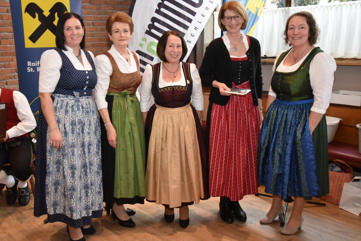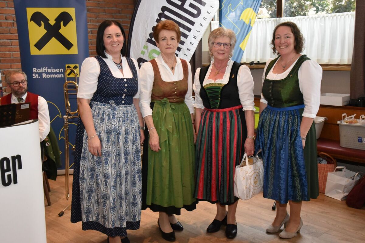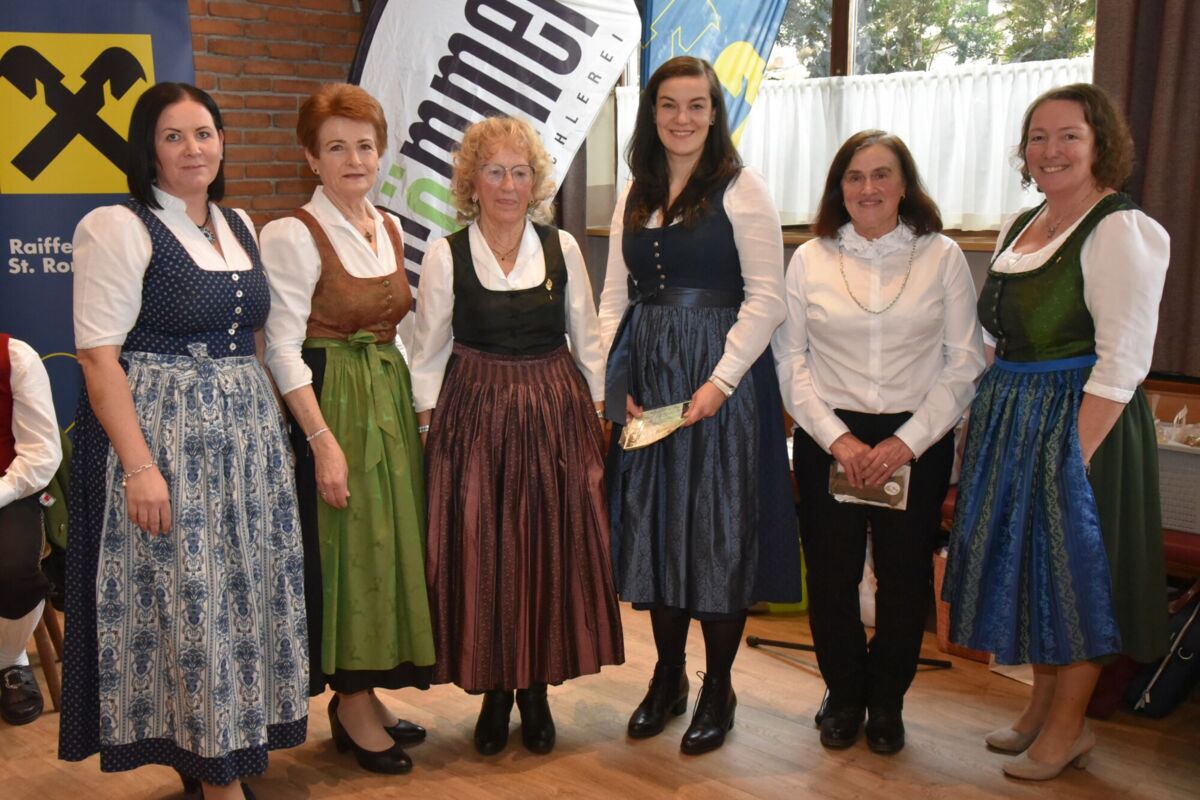 Im Rahmen der Ehrungen wurden Jubiläen gefeiert und neue Goldhaubenfrauen feierlich aufgenommen. Große Aufmerksamkeit erhielt die Präsentation „50 Jahre Goldhaubengruppe St. Roman“. Dabei wurden auch zwei neue Mitglieder vorgestellt, deren Tracht und Gold- bzw. Perlhauben von der Gründungsobfrau Katharina Penzinger umgearbeitet wurden und nun von Maria Hötzendeder weitergetragen werden – ein starkes Symbol für gelebte Weitergabe von Tradition.