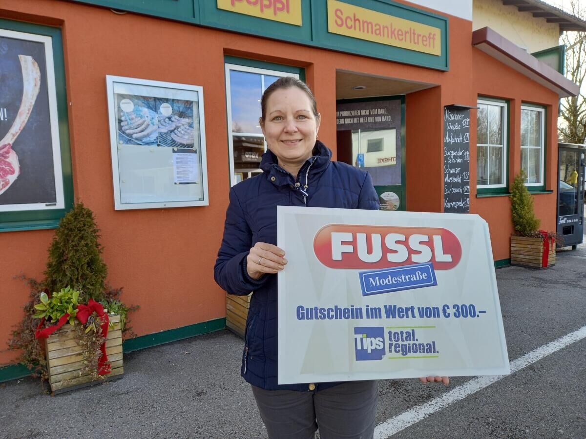 ANDORF. Das Tips-Glücksengerl ist wieder unterwegs und überraschte in Andorf Sandra Dantler aus Eggerding mit einem Fussl-Gutschein im Wert von 300 Euro.