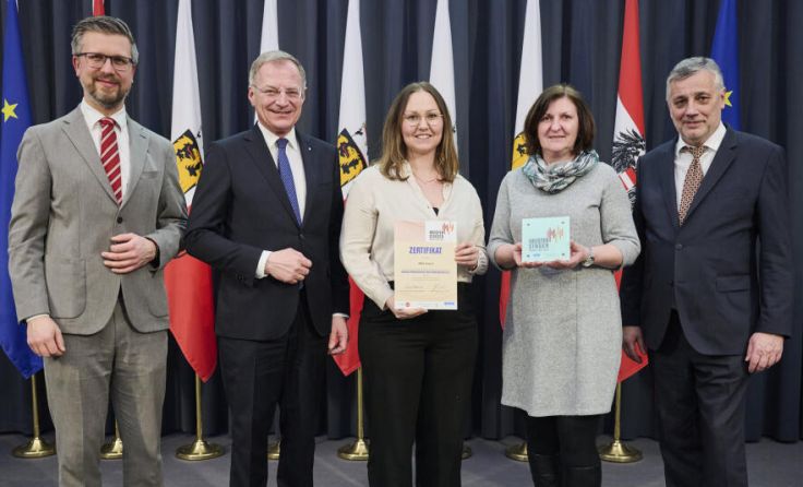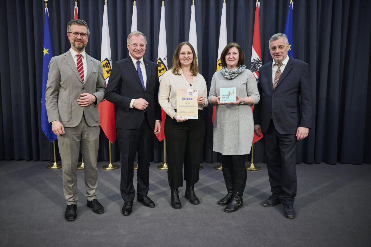 Das Gütesiegel erhalten Schulen für ihre besonderen musikalischen Leistungen. Die beiden Pädagoginnen Victoria Hell und Gertraud Kagerer nahmen die Auszeichnung für die MMS Andorf von Landeshauptmann Thomas Stelzer und Bildungsdirektor Alfred Klampfer entgegen.