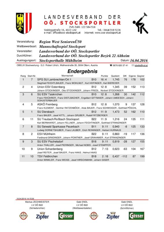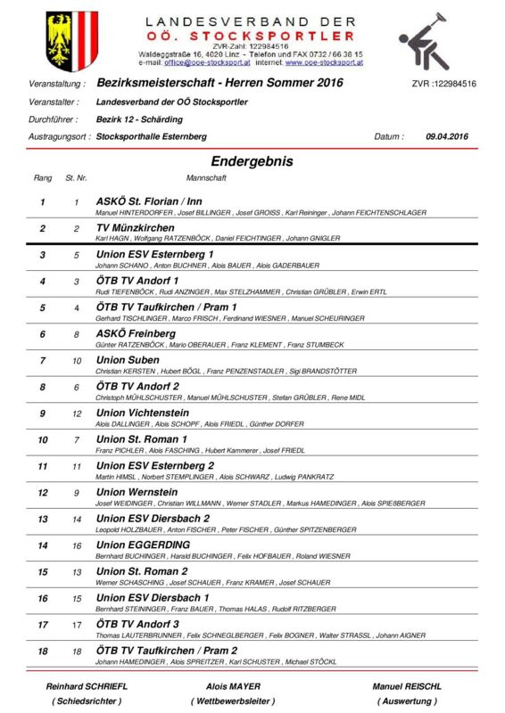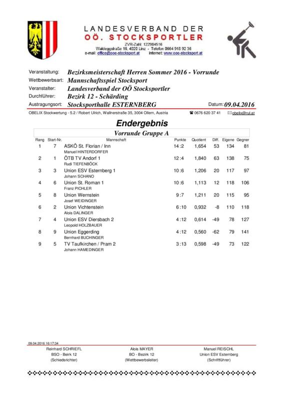 Die Seniorenmannschaft Ü50 der Union ESV Esternberg (Johann Stockinger, Otto Stockinger, Norbert Stockinger, Johann Friedl ) erreichte bei der Regionsmeisterschaft den hervorragenden 2 Platz hinter der SPG Lambrechten / Ort.Diese beiden Mannschaften lösten somit das Aufstiegsticket zur Oberliga Meisterschaft am 30.4.2016 in Attnang/Puchheim.Herzlichen Glückwunsch.