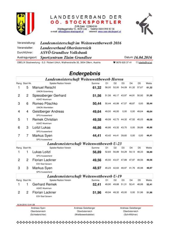 OÖ Landesmeisterschaft im Weitschiessen ging am 16.4.2016 im steirischen Grundlsee über die Bühne.Manuel Reischl von der Union ESV Esternberg wurde Herren Landesmeistermit 61,32m.