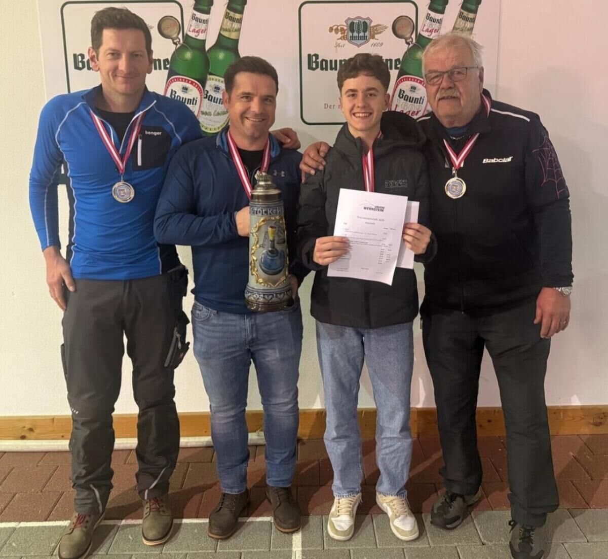 Die Ortsmeisterschaft auf Plaster in der Unionhalle bot ebenfalls spannende Wettkämpfe. Der erste Platz war hart umkämpft. Den Sieg sicherten sich die „Medaillenjäger“ Günther Ratzenböck, Josef Weidinger, Alois Huber und Günter Scharnböck. Zweiter wurde das Team „Mosthäusl“ – vor der Mannschaft Union Wernstein.
