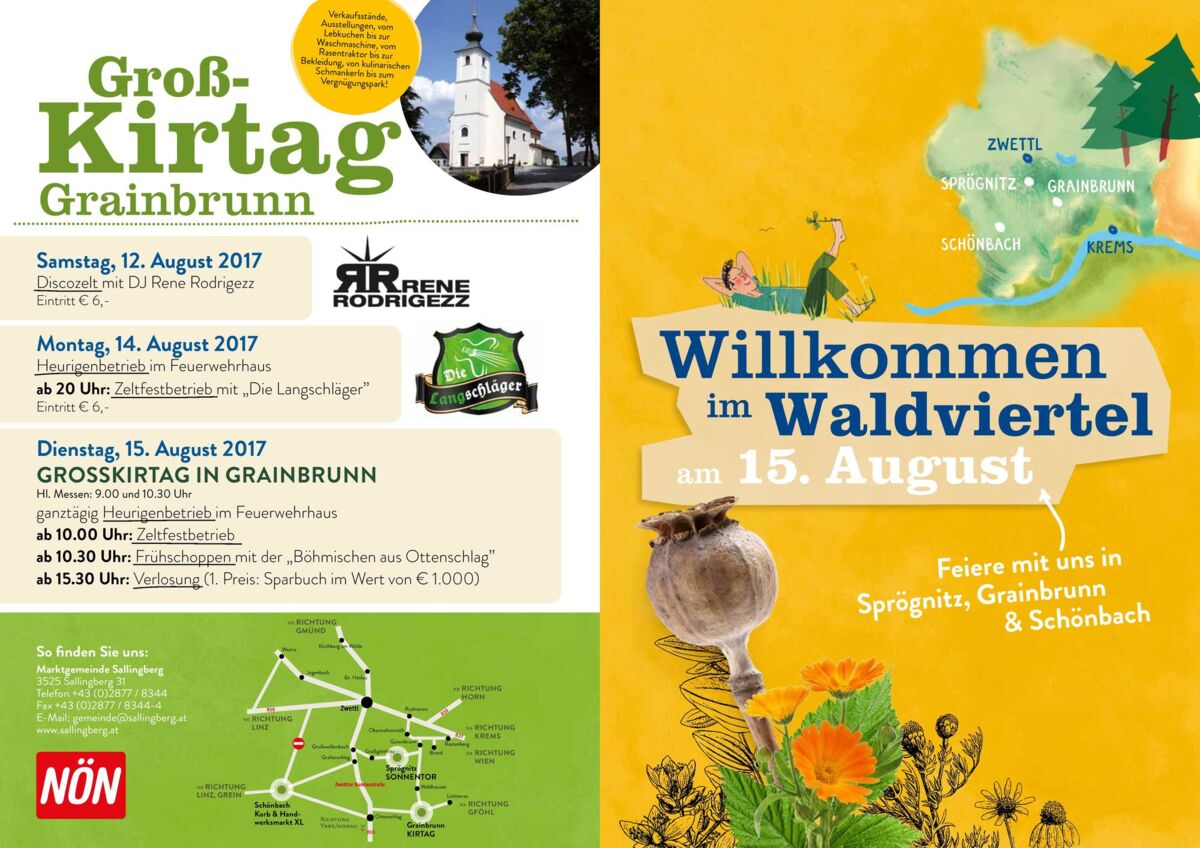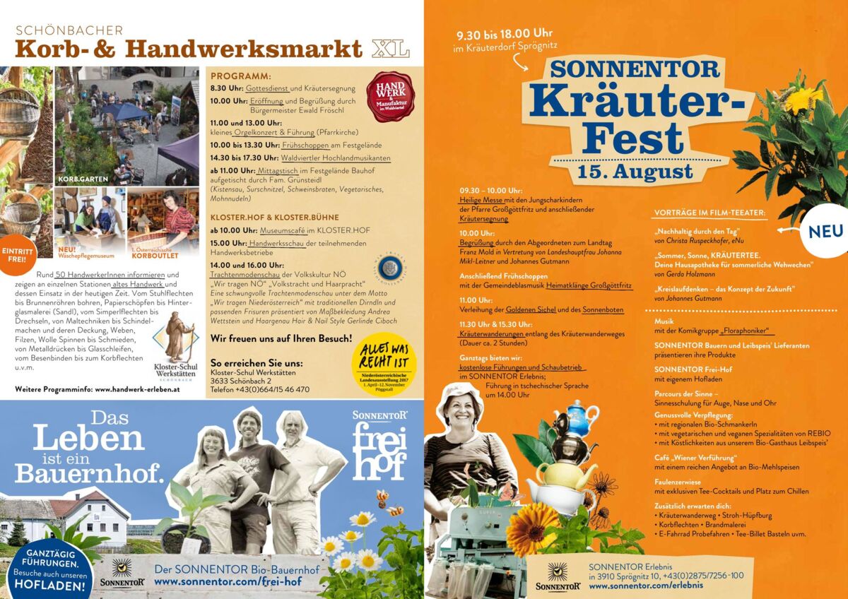Parallel zum Handwerksmarkt finden das große Sonnentor-Kräuterfest in Sprögnitz sowie der Großkirtag in Grainbrunn statt, all das kann optimal verbunden werden. Der 15. August - ein erlebnisreicher Tag für die ganze Familie.