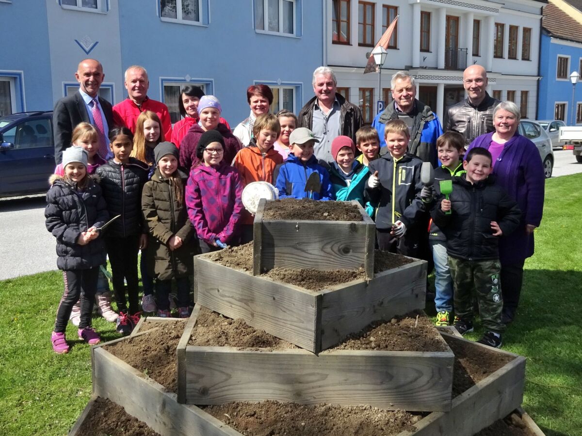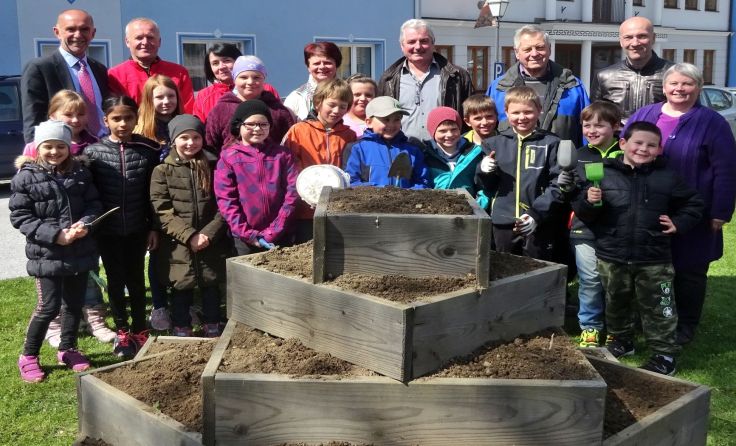 SCHWEIGGERS. Bei sonnigem Wetter setzten die Schüler der dritten Klasse der Volksschule Schweiggers heuer 20 verschiedene Erdäpfelsorten, in die von den Gemeindearbeitern vorbereiteten Erdäpfelpyramiden am Anger.