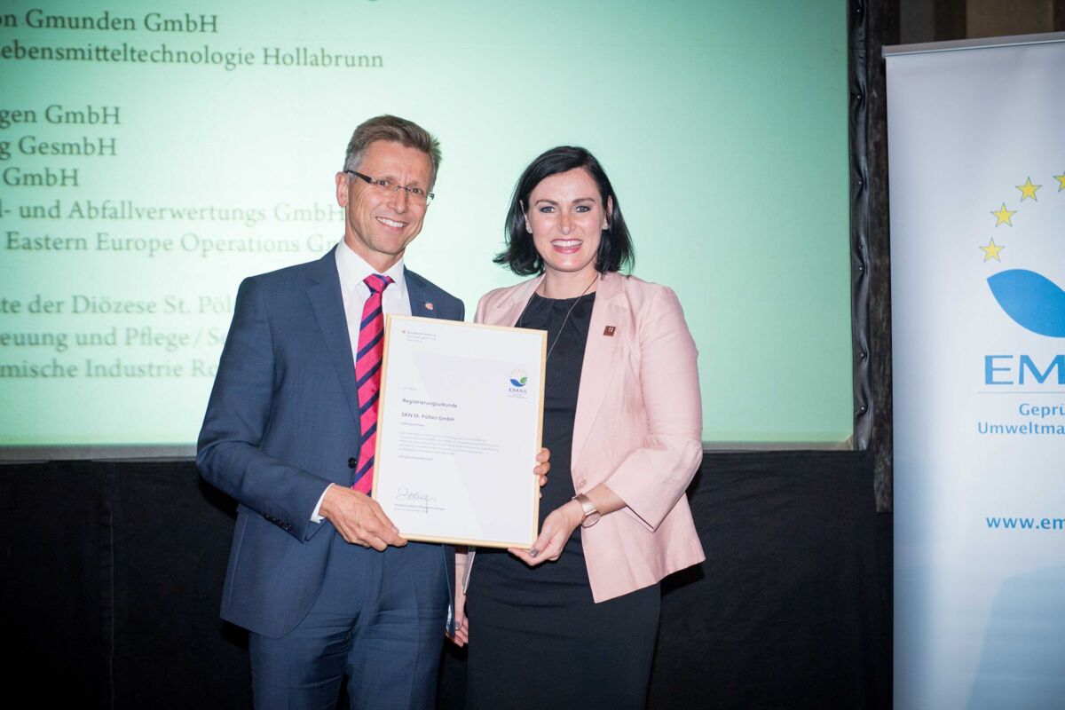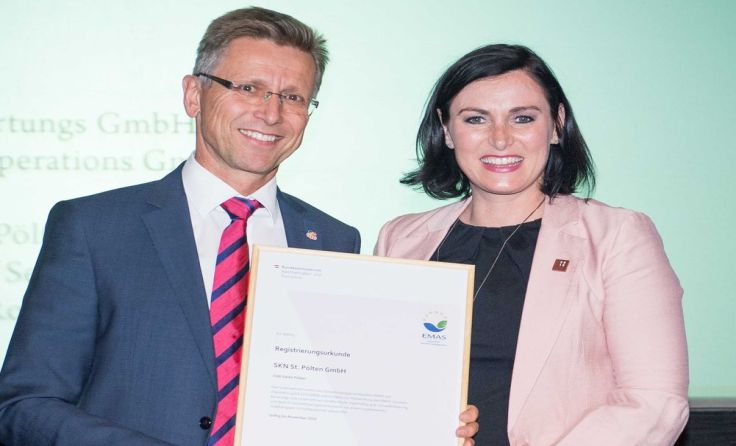 ST. PÖLTEN/WIEN. Der SKN St. Pölten wurde als erster Sportverein in Österreich als EMAS zertifizierter Betrieb ausgezeichnet. SKN-Präsident Helmut Schwarzl erhielt vergangene Woche die EMAS-Urkunde im Rahmen eines Festakts in Wien von Nachhaltigkeitsministerin Elisabeth Köstinger (ÖVP).