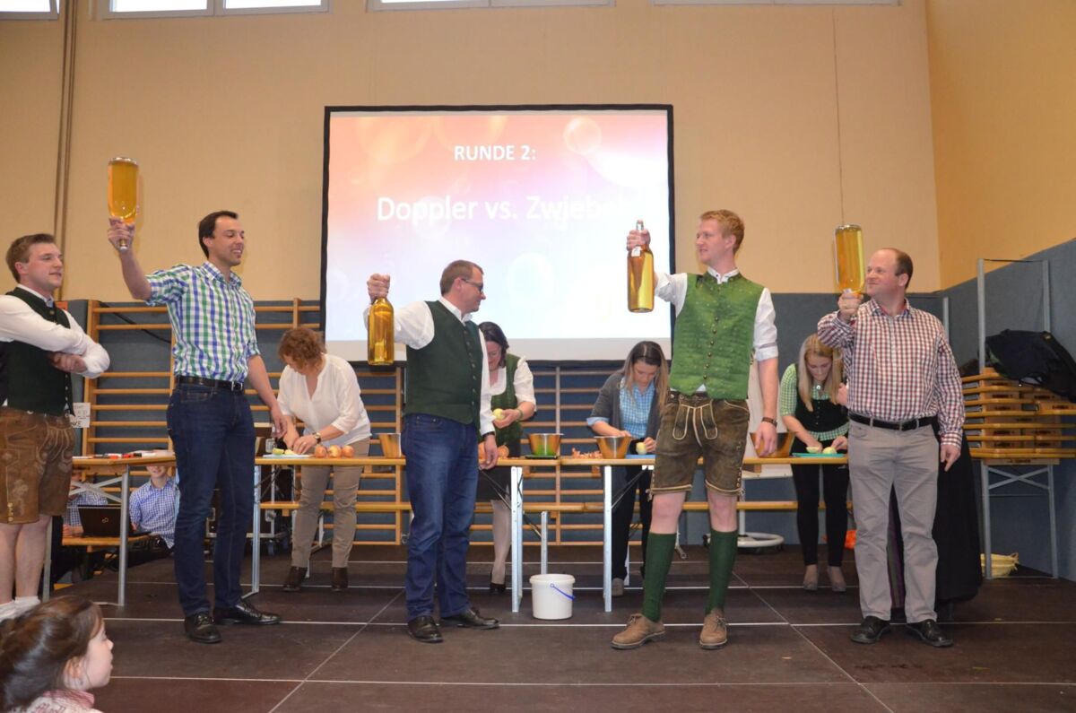 Unter dem Titel „Spiel für deine Gemeinde“ kämpften jeweils zwei Vertreter der sechs Steinerkirchner Nachbargemeinden um den Sieg, den sich die Eberstalzeller knapp vor Sattledt sicherten. Markus Brandmayr und Sandra Achleitner meisterten die Einstiegsfragen und schafften mit Geschick und Ausdauer Runde zwei, in der die Damen so viele Zwiebeln wie möglich schneiden mussten, während die Männer beim Most-Doppler-Stemmen ihre Kraft zur Schau stellten. In Zusammenarbeit mit dem Publikum holten sie sich bei den abschließenden Spielen den Sieg. Im Anschluss an „Spiel für deine Gemeinde“ begeisterte die Vorchdorfer Plattlergruppe „Mid Händ und Fiaß“ die Gäste. Die vielen Mostkostbesucher ließen den ereignisreichen Sonntag noch im Partyzelt, wo eine große Vielfalt an heimischen Schnäpsen angeboten wurde, ausklingen.