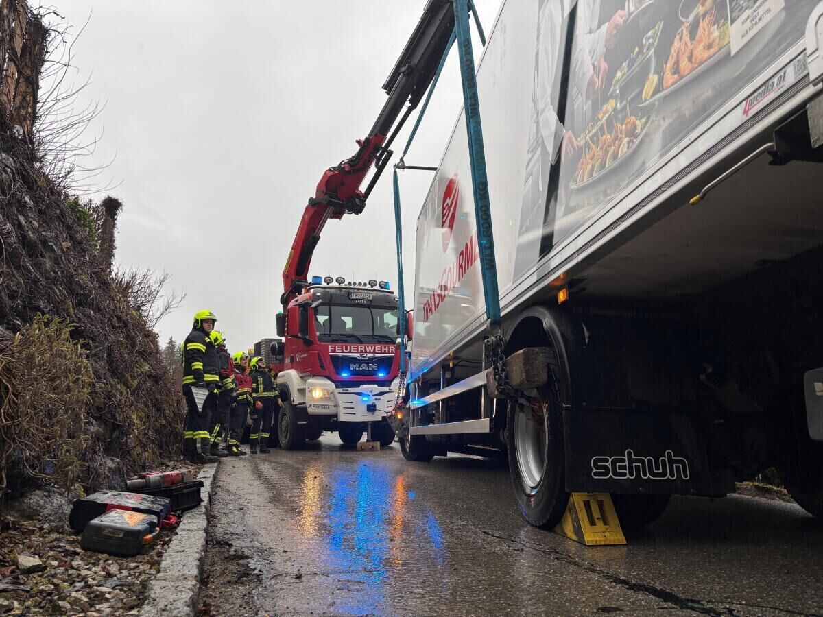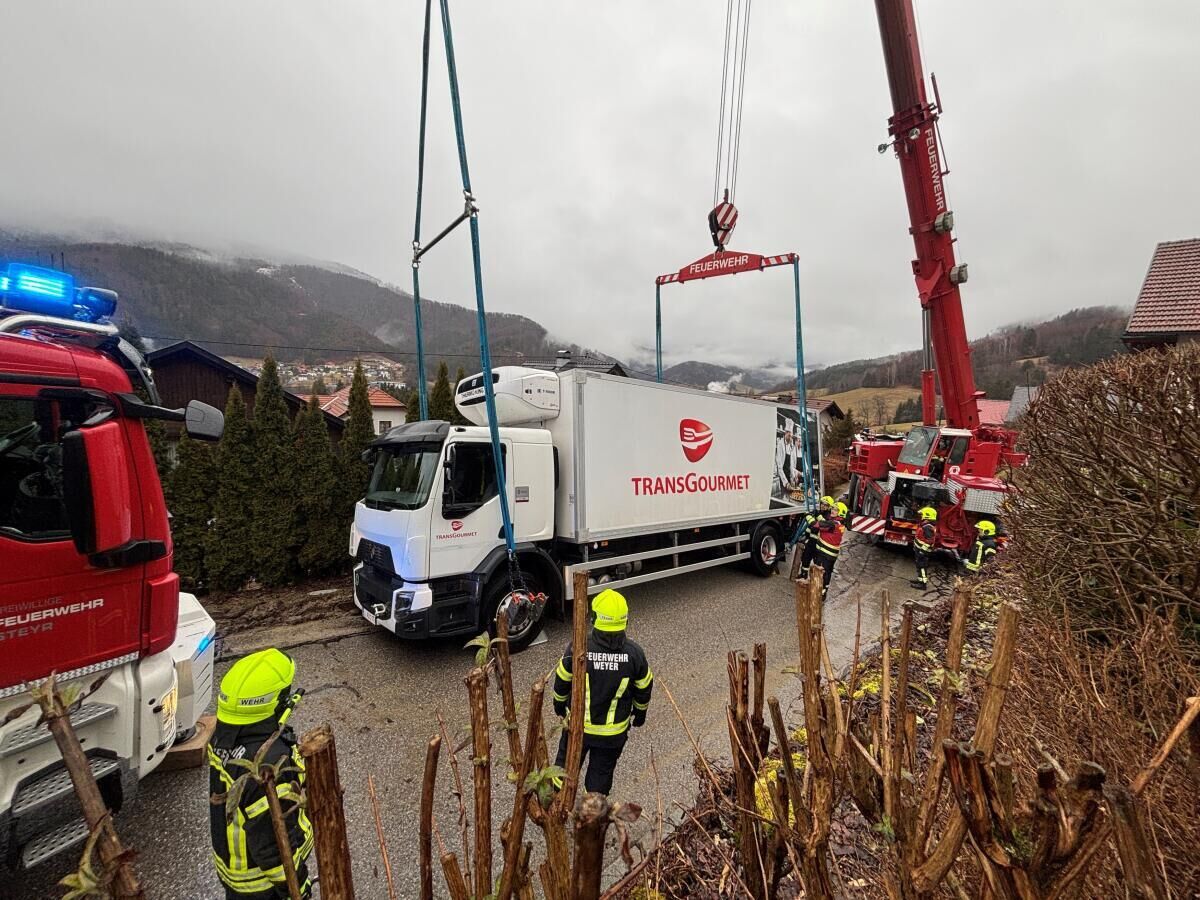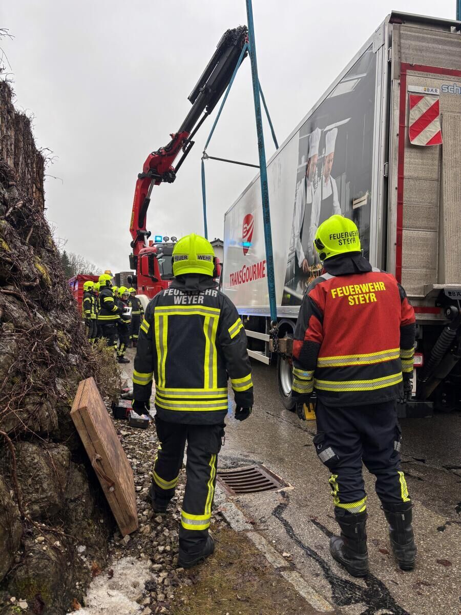 WEYER. Ein Kühl-Lkw rutsche am Dienstag in Weyer auf einem Bankett ab und fuhr sich fest. Bei der Bergung wurde die örtliche Feuerwehr vom Technischen Zug aus Steyr unterstützt.