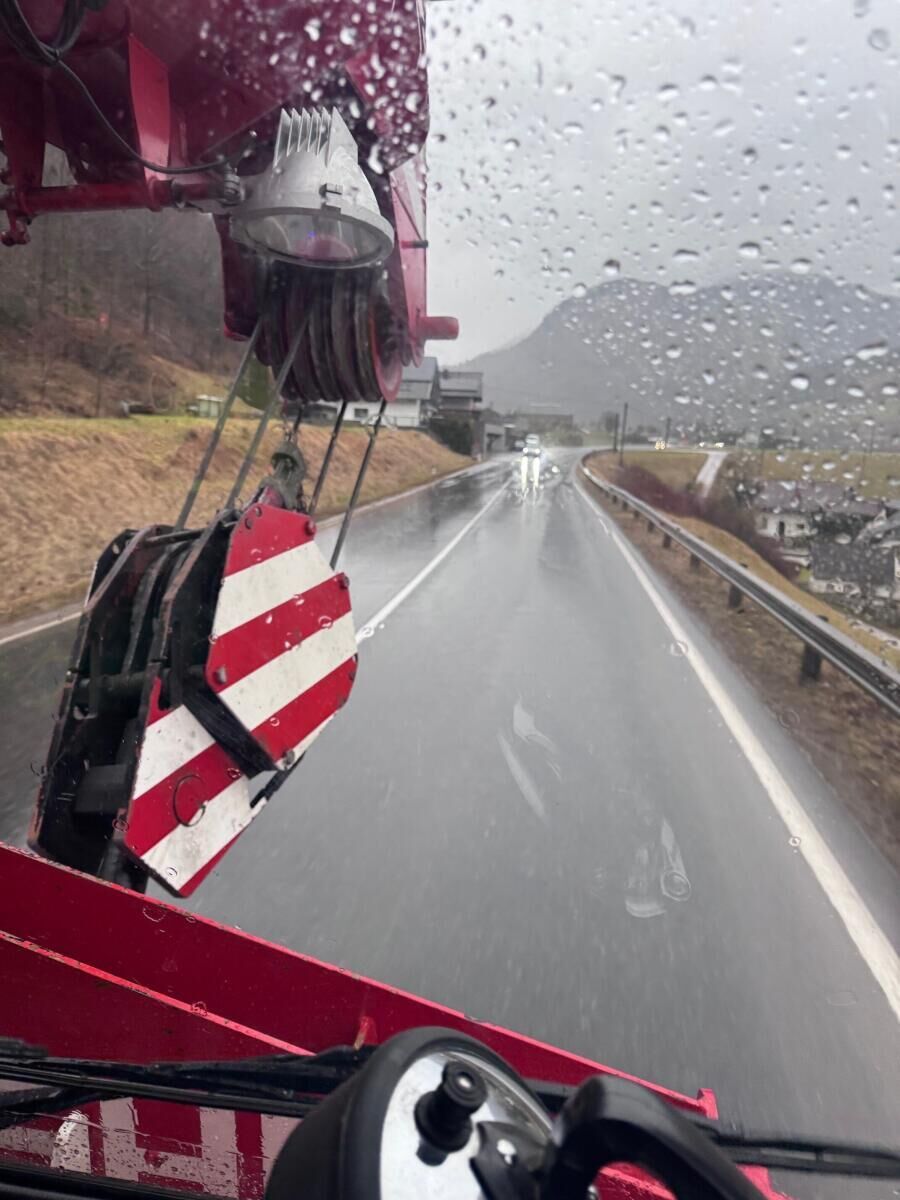 Aufgrund der Schräglage und des Höhenunterschiedes des Banketts zur Fahrbahn entschied man sich für eine Bergung mit zwei Kränen.