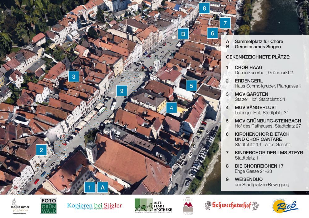 Letztes Jahr waren 7 Chöre an schönen Plätzen außerhalb der Innenstadt. Dieses Mal werden einige der schönsten Arkadenhöfe für das Plätzesingen und seinem Publikum geöffnet. Im Vorfeld werden bereits eine große Anzahl von Flyer verteilt, auf denen Sie leicht erkennen können, wo genau Ihr Chor der Wahl seinen Platz hat. Natürlich sind Sie eingeladen sämtliche Chöre zu besuchen. Jeweils am Eingang in die einzelnen Höfe sind Ständer aufgestellt mit dem Namen des Chores und dem Namen des Hofes. Es wird auch ein Bläserduo - das „Weisenduo“ - immer wieder von Eingang zu Eingang ziehen und Sie mit ihrer Musik dazu einladen, sich den Innenhof anzuschauen und dem Chor zu lauschen. Um ca. 11:40 Uhr strömen alle Chöre in den Bereich Fußgängerzone vor dem alten Gericht und werden in einem Großchor unter der Leitung von Helmut Schaumberger den gesungenen Vormittag ausklingen lassen. Anschließend verabschiedet Bürgermeister Gerald Hackel die Chöre mit einem Dank für das unentgeldliche Engagement und wird sie sicherlich auch für die nächste Veranstaltung einladen. Die 8 Chöre sind:Chor Haag, Erdengerl, Die Chorreichen 17, Kinderchor der LMS Steyr, Kirchenckor Dietach mit dem Chor Cantare , der MGV Garsten, der MGV Grünburg-Steinbach und der Organisator, der Steyrer MGV Sängerlust