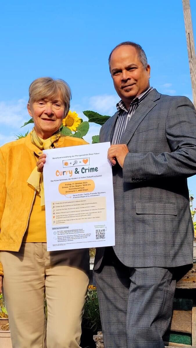 Dann lädt nämlich die Pfarrgemeinde Steyr-Tabor zur Benefizveranstaltung „Curry & Crime“ ein. Unter dem Motto „Namaste & Nächstenliebe“ bekommt man an diesem Abend nicht nur indische Küche serviert, sondern auch einen kleinen Kriminalfall aufgetischt. Der wird übrigens live und von Persönlichkeiten aus Steyr aufgedeckt. So ist etwa auch Pater Ransom Pereira mit dabei. Er sorgt für den Krimi-Schmaus, wird neben einem authentischen Curry auch andere indische Köstlichkeiten zubereiten. Und natürlich darf auch sein musikalischer Touch nicht fehlen.