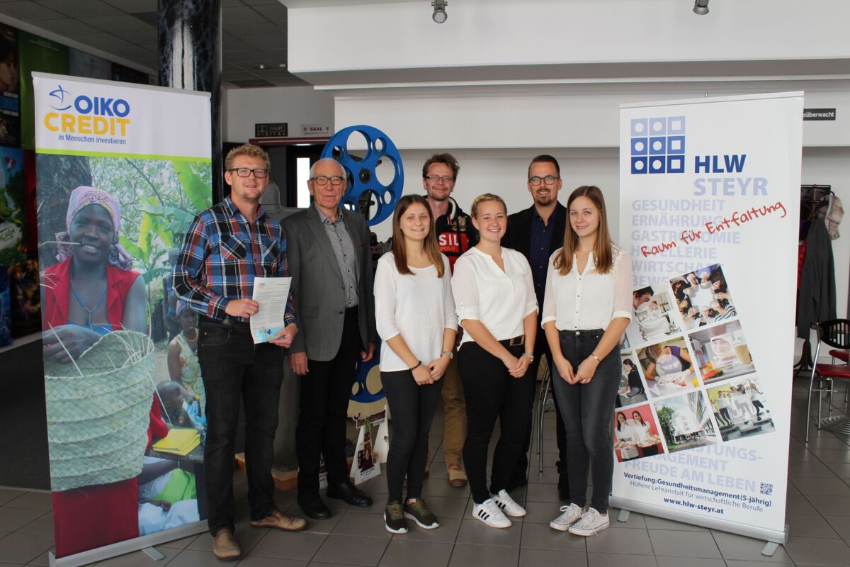 Hannah Schausberger, Selin Wallner und Katharina Kopf aus der 5CHL der HLW Steyr gaben gemeinsam mit Viktor Leutgeb, einem Spezialisten für Mikrokredite von Oikocredit Austria einen kurzen Einblick in das Thema „Entwicklungszusammenarbeit“ und in die Welt der Mikrokredite. Geladen waren alle fünften Jahrgänge der HLW Steyr.