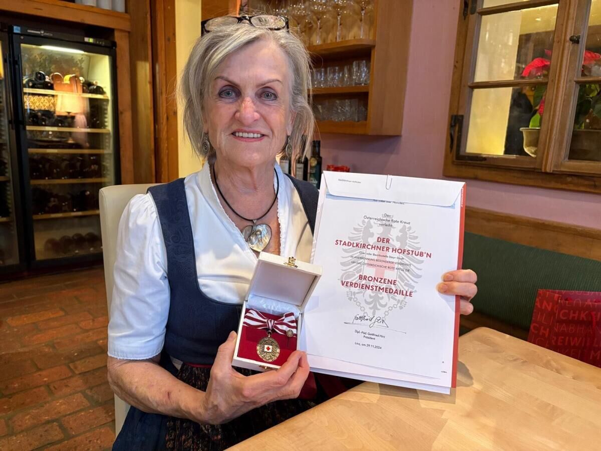 Als Dank übergaben sie und RK-Bezirksgeschäftsleiterin Kornelia Ahrer die bronzene Verdienstmedaille an Hofstub'n-Chefin Hermine Hanke für ihre jahrelange Unterstützung.