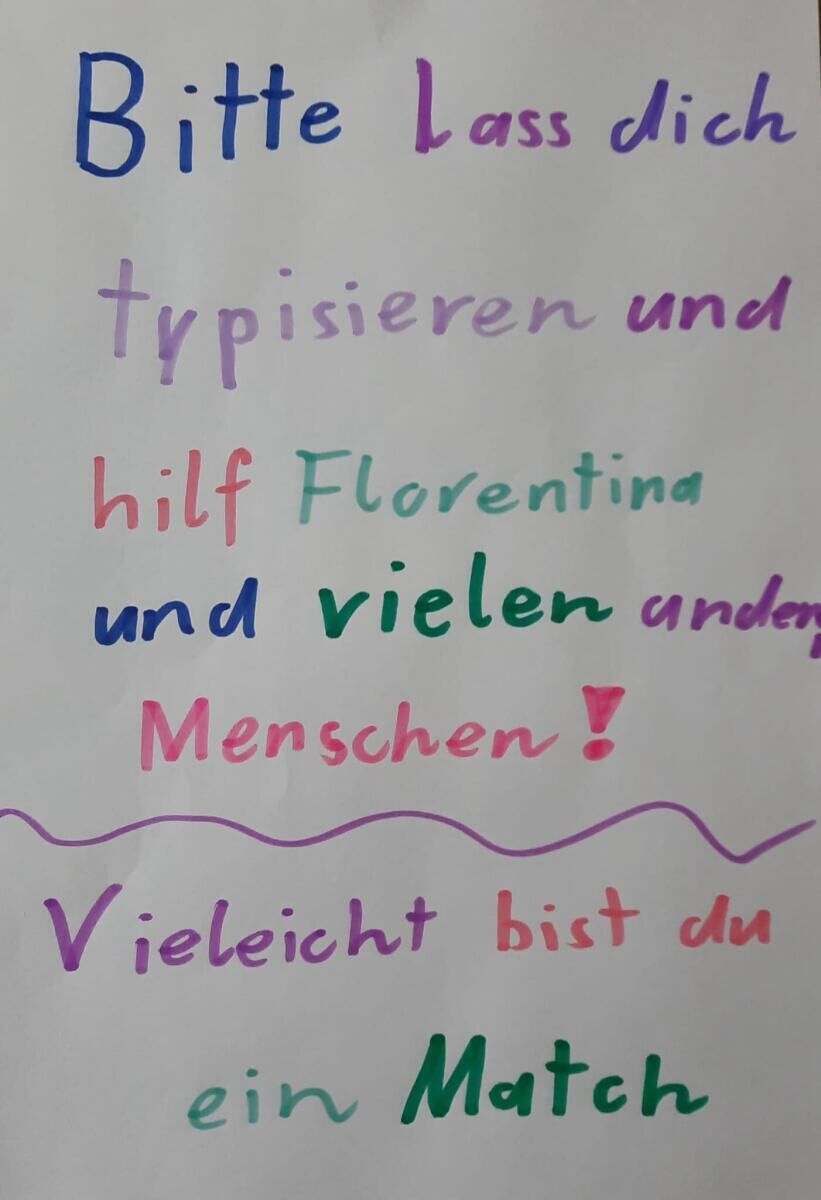 Für Florentina besteht die einzige langfristige Heilungschance in einer Stammzelltransplantation. Dafür wird dringend ein genetisch passender Spender oder gesucht. Nur so kann ihr Immunsystem dauerhaft stabilisiert und ihr eine gesunde Zukunft ermöglicht werden. Nur dann kann sie auch weiterhin lachen, fröhlich sein und die Welt entdecken. Die Suche nach einem geeigneten „genetischen Zwilling“ läuft – doch die Zeit ist ein entscheidender Faktor.