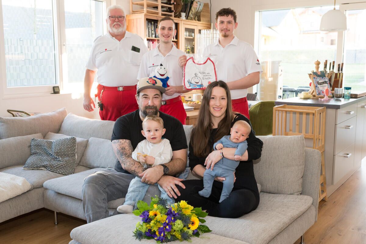 Die Rotkreuz-Mitarbeiter kamen mit einem kleinen Geschenk vorbei und nutzten die Gelegenheit, der Familie nochmals zur Geburt zu gratulieren. Einen frischen Blumenstrauß für die Mutter gab es selbstverständlich auch.