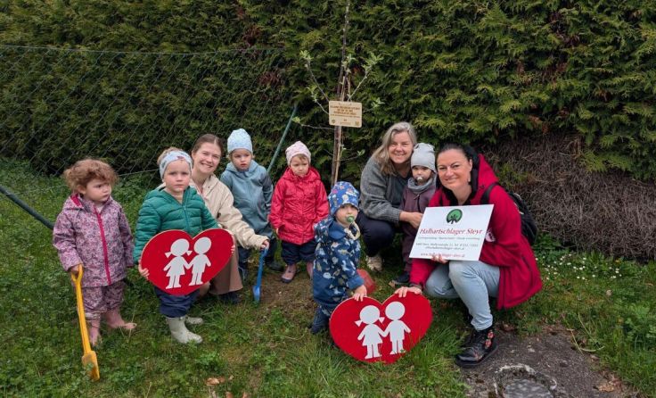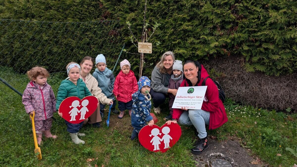 Mit dabei bei der Aktion sind die Kinderfreunde Steyr-Kirchdorf, die vor der Krabbelstube Kuschelbär in der Waldrandsiedlung in Steyr einen Apfelbaum pflanzten.