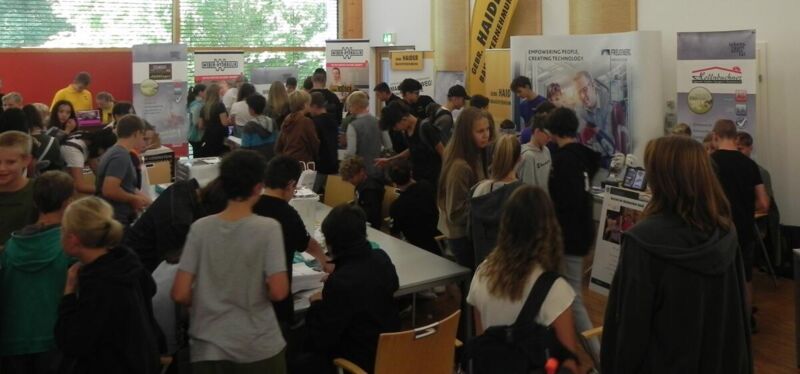 Jeder ausstellende Betrieb war mit einem Lehrling am Stand vertreten. Die Lehrlinge übernahmen die Moderation des Tages und standen den interessierten Schülern Rede und Antwort.