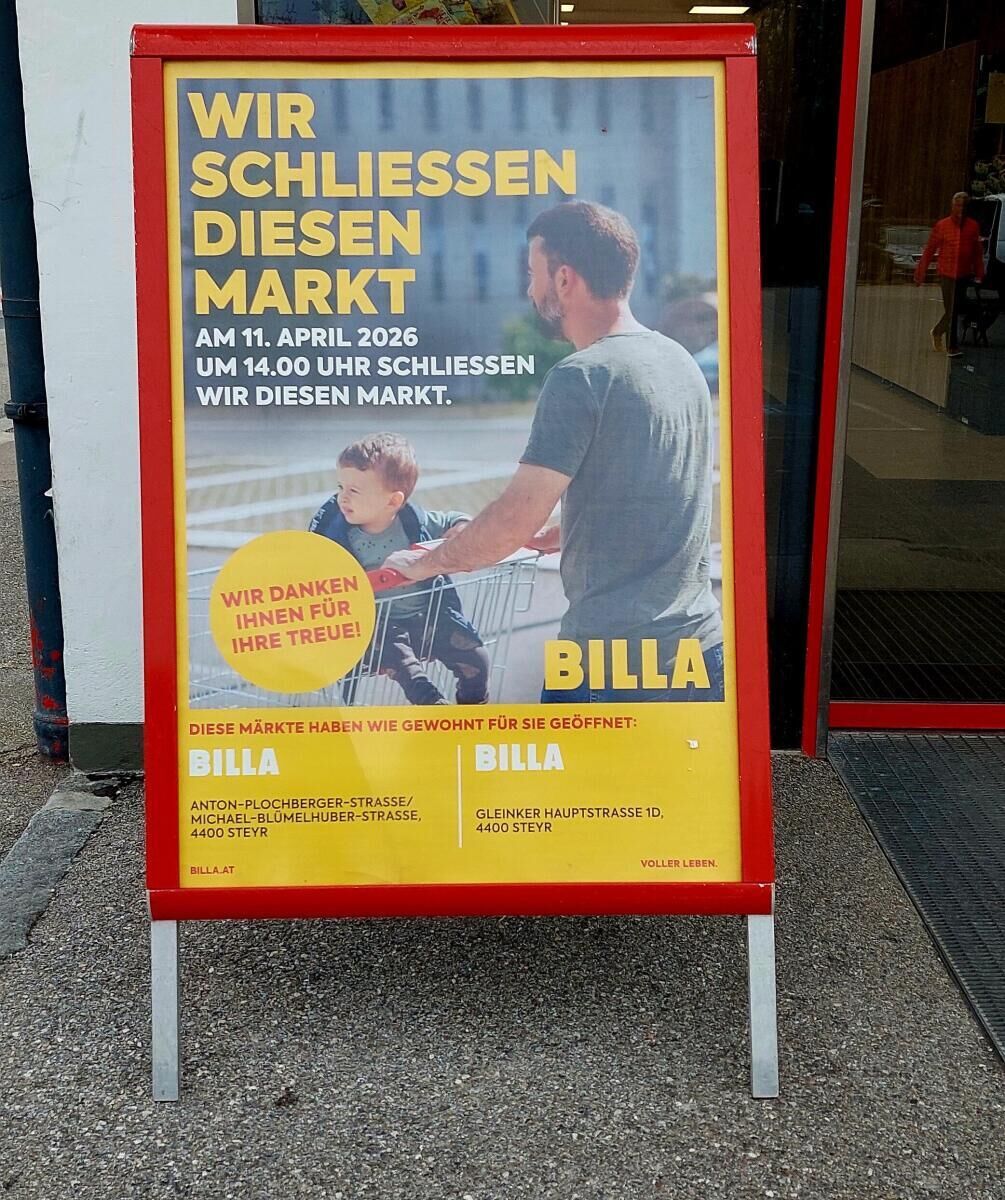 Gründe für die Schließung werden am Plakat nicht genannt. Man bedankt sich bei den Kunden für die Treue und verweist auf die Billa-Filialen in Gleink und im Einkaufszentrum Hey am Tabor.