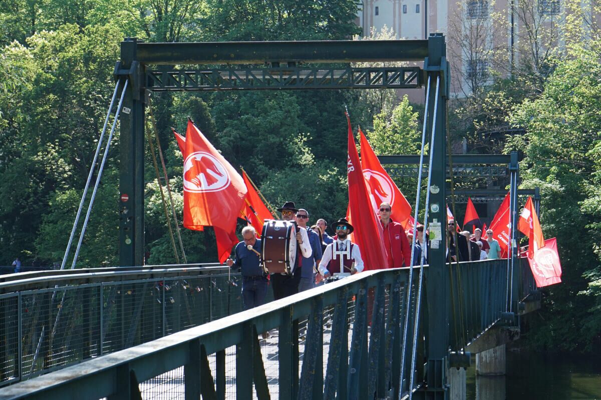 Beginn der Kundgebung beim Museum Arbeitswelt ist um 10 Uhr. Zuvor ziehen SPÖ-Abordnungen und rote Gewerkschafter:innen und Rote Falken über den Museumssteg auf dem Kundgebungsplatz ein.