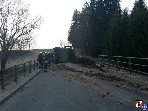 Die Zugmaschine samt Anhänger kam kurz nach der Anprallstelle zum Stillstand, wobei der Anhänger auf der rechten Seite zum Liegen kam. Die übelriechende Fracht wurde dabei auf der Fahrbahn verteilt.